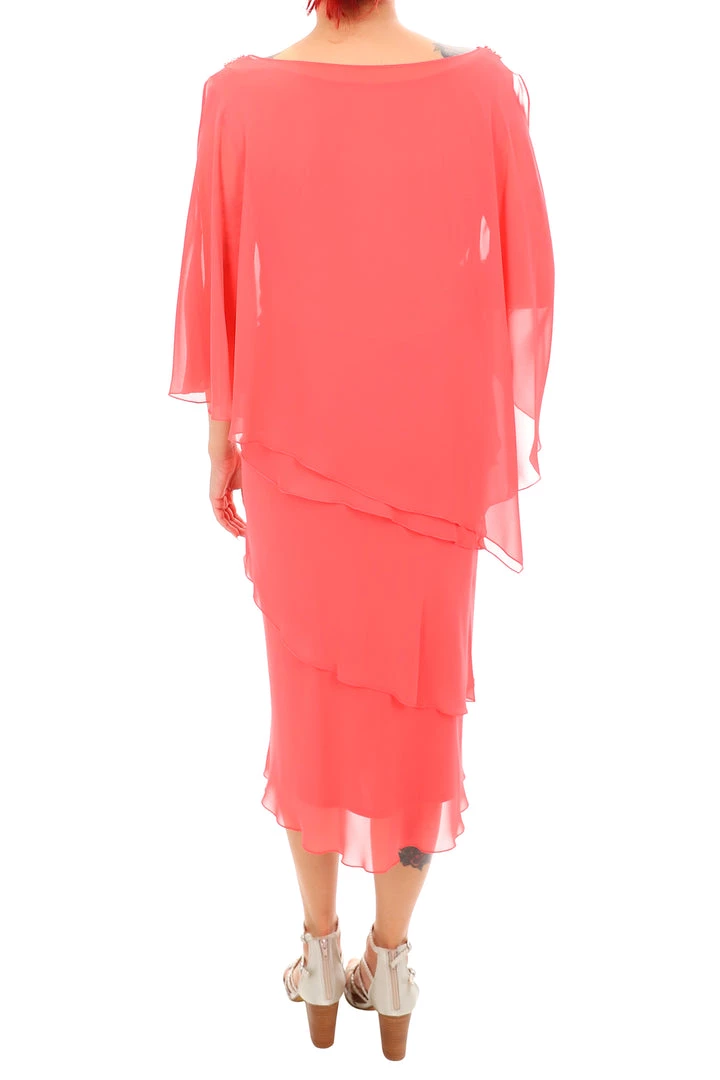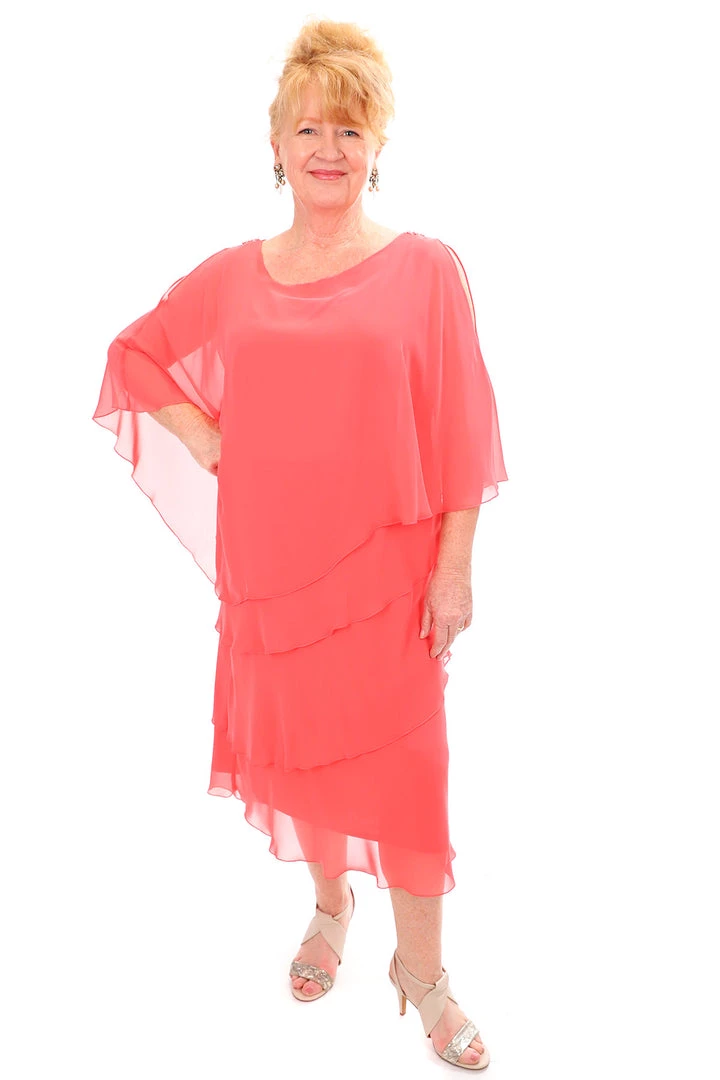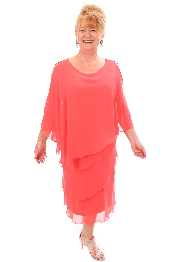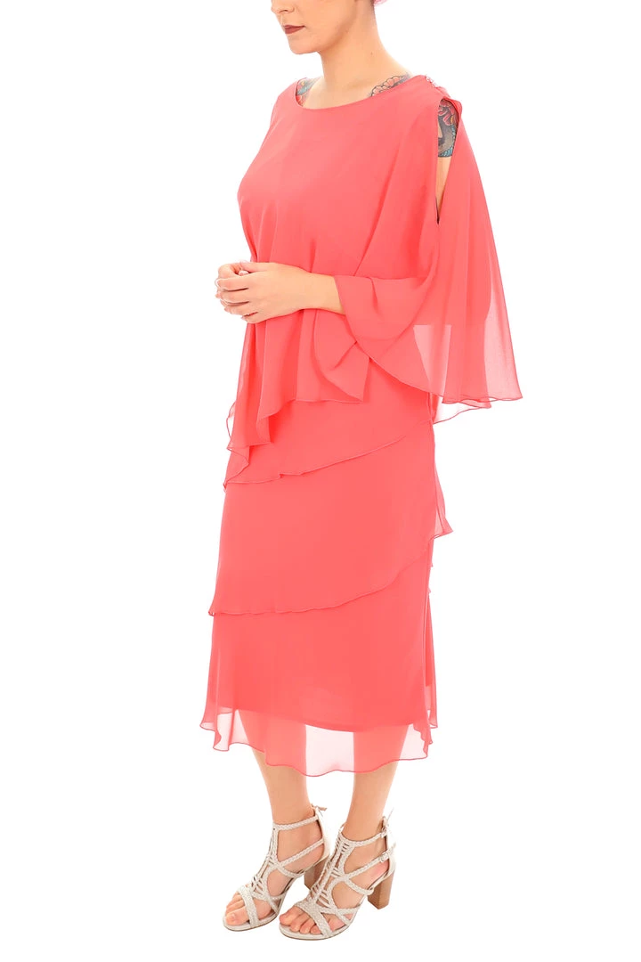 Looking for the perfect dress for your next special occasion? Look no further! This Tiered Chiffon Dress by Layla Jones Formalwear in stunning Coral is perfect for every special event and will have you feeling like a million dollars when you wear it! The dress features a silver lining with layers of Coral Chiffon and a split shoulder cape sleeve. It has a flattering below the knee hemline and is simply perfect for wearing at weddings, to the races or any special event! Style this dress your way with a long elegant necklace and sparkly shoes for a showstopping look that is timeless.