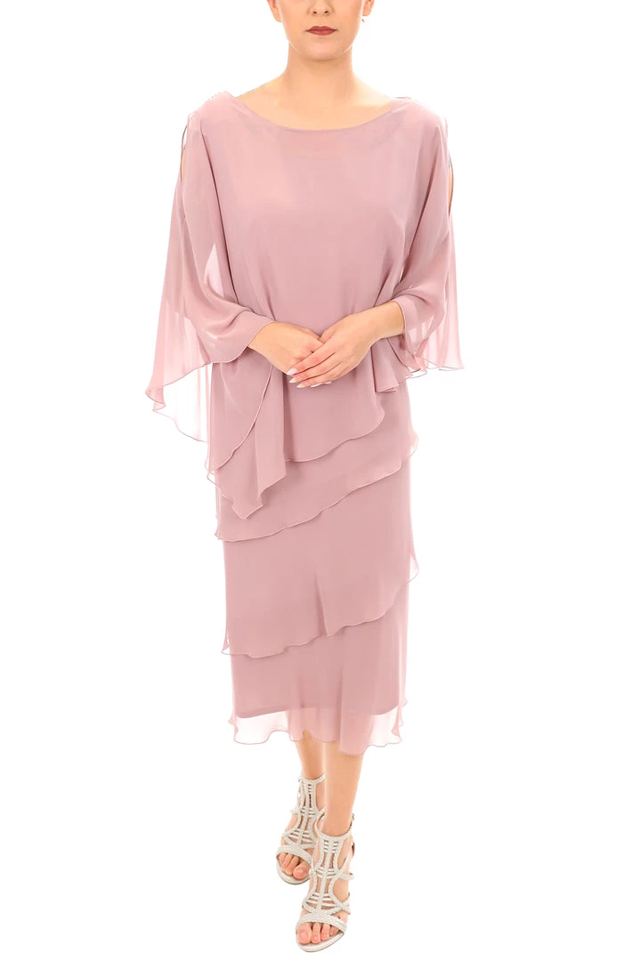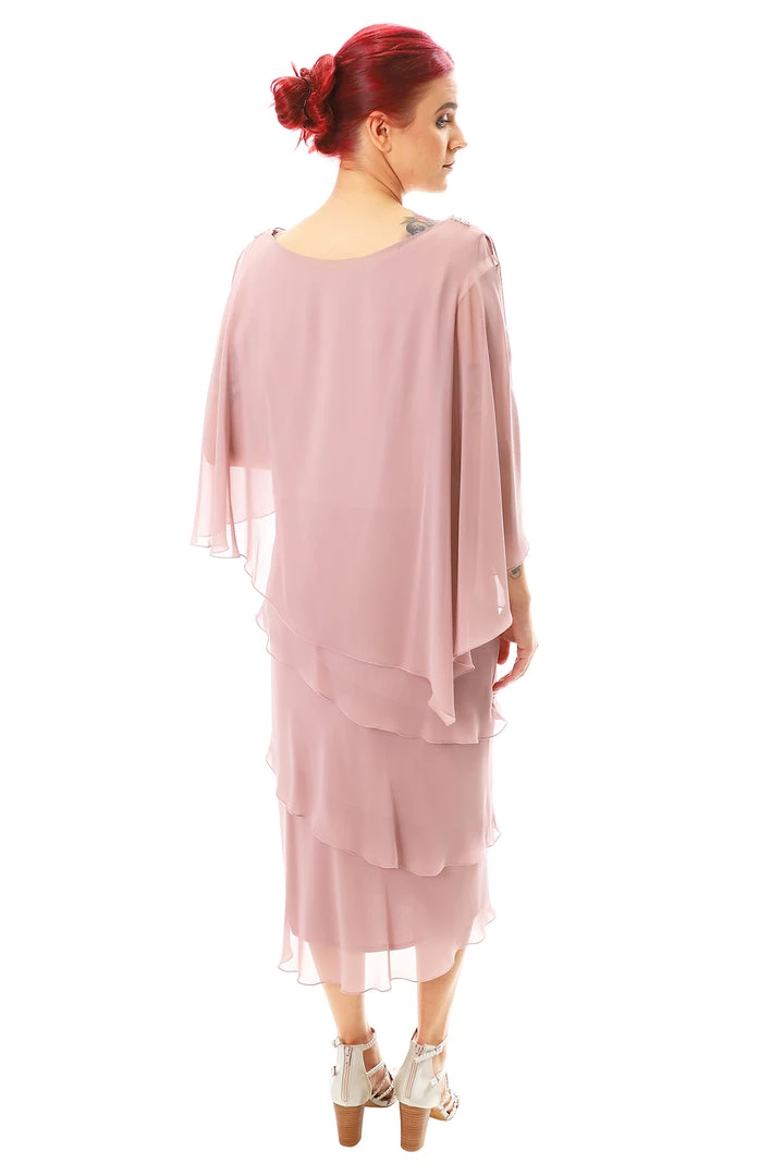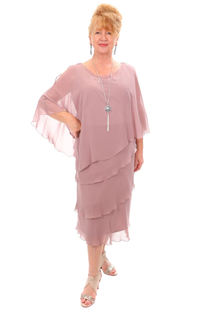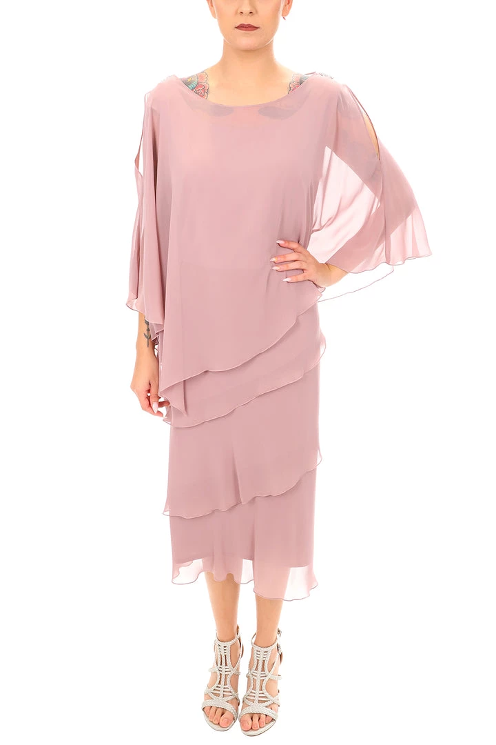 Layla Jones formalwear has designed the Tiered Chiffon Dress in Tea Rose for the modern woman with a taste for decadence! With an elegant layering of chiffon tiers, a split shoulder cape sleeve and below the knee finish this classy silver evening dress is unforgettable! This decadent Layla Jones formal dress is perfect for weddings, races and events!