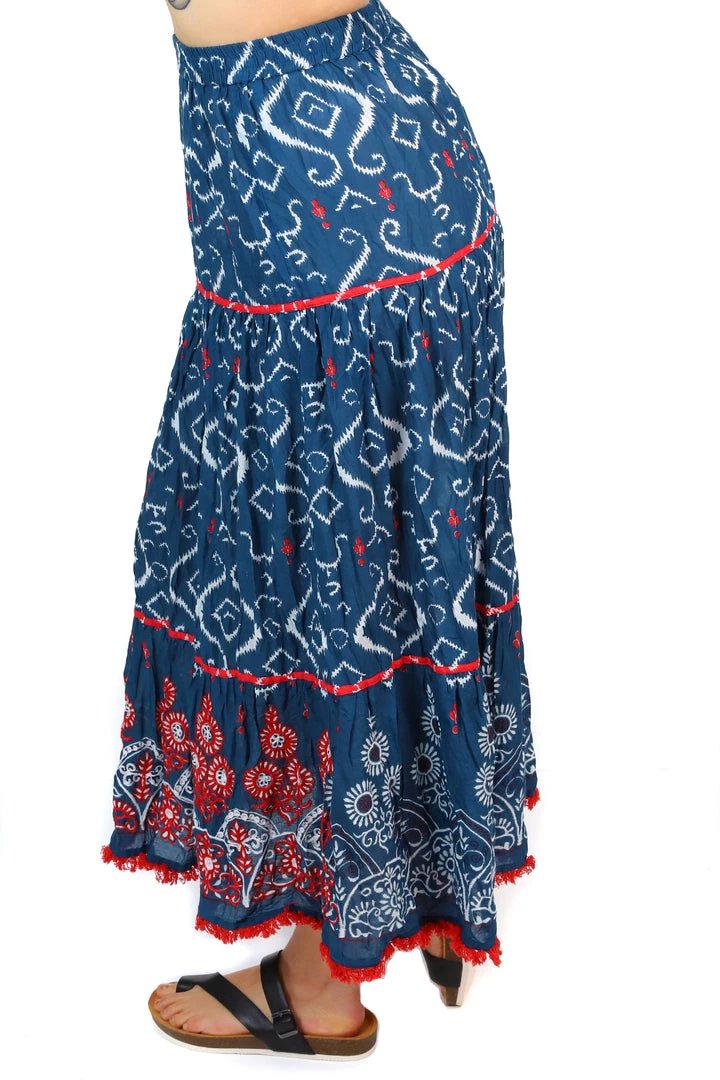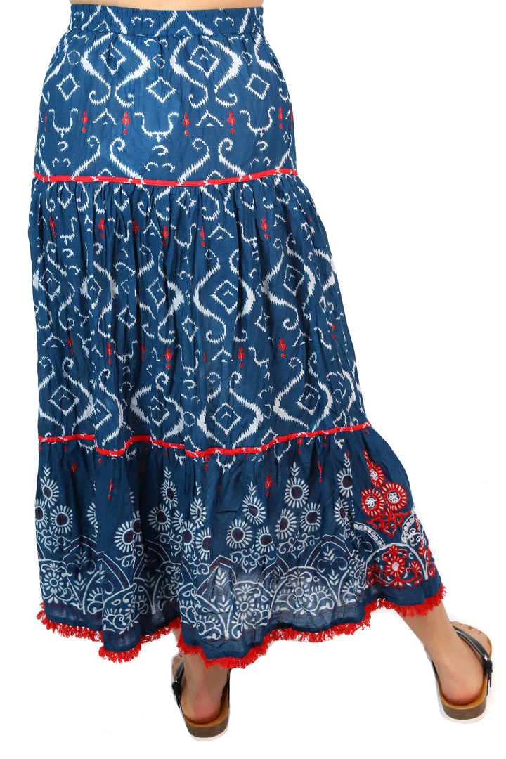 The Rottnest Skirt by Lula Life is a free flowing summer midi skirt that will fill your day with comfort, colour and inspiration! Made from pure cotton, this navy elastic waist skirt comes alive through the abstract white pattern. Trimmed with a vibrant red fringe and exploding with detail through the red and white embroidery the Rottnest Skirt by Lula Life has depth and beauty while remaining light weight and moveable – perfect for exploring the world this Summer!