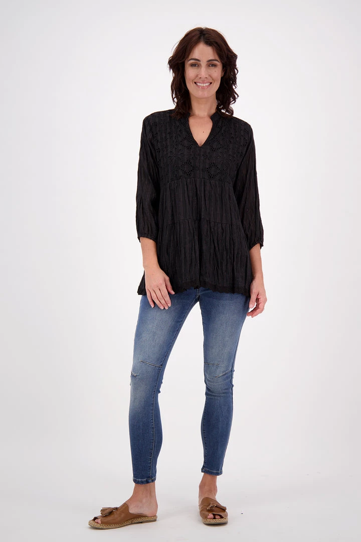 The Lennox Tunic is a perfect long line top for ladies who prefer a sleeve. It features a long V- neck and lace trim on the three quarter length sleeves & hem. The Pizazz styling tip for this tunic is to team the top with with shorts in warmer weather or your favourite jeans in winter which will see this top take you right through all seasons.