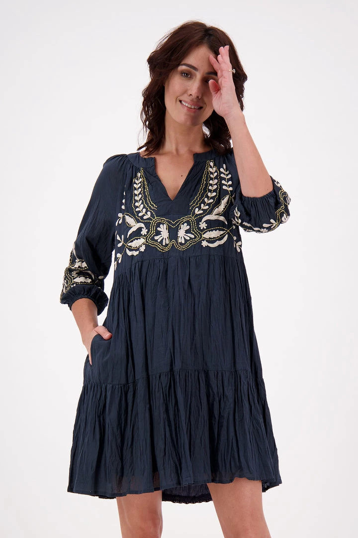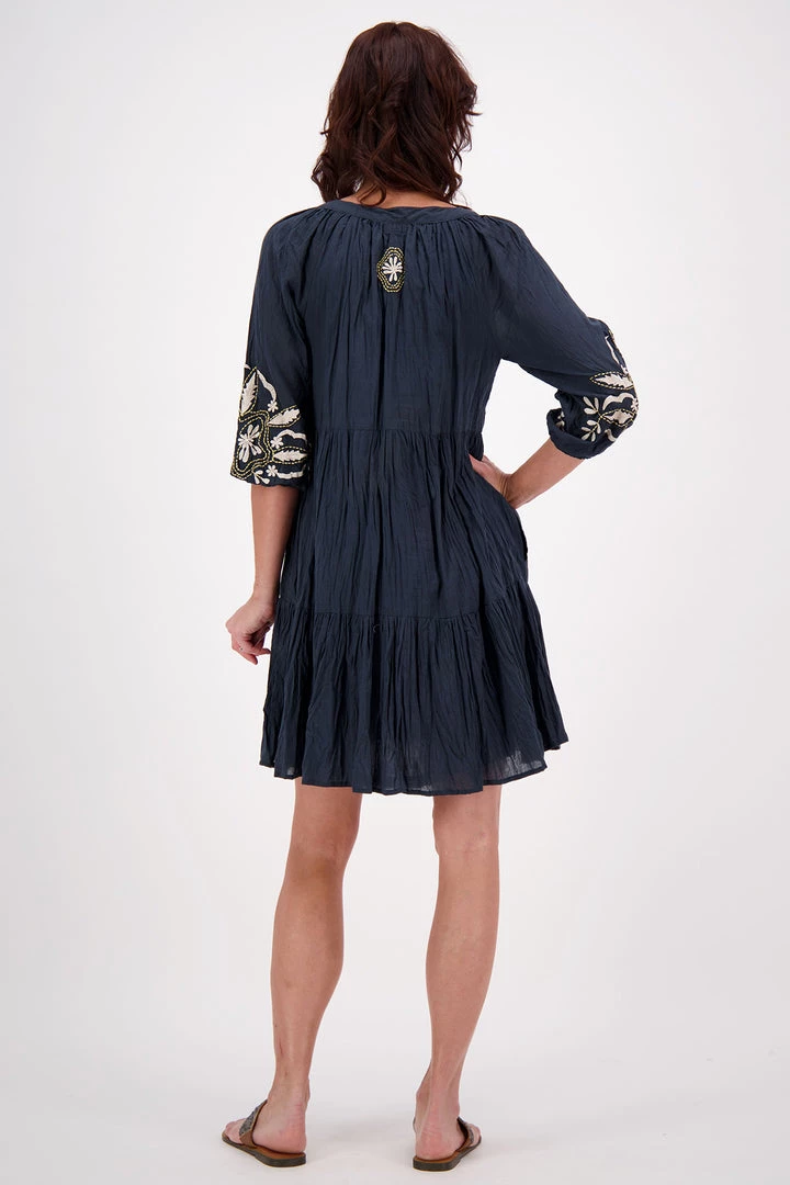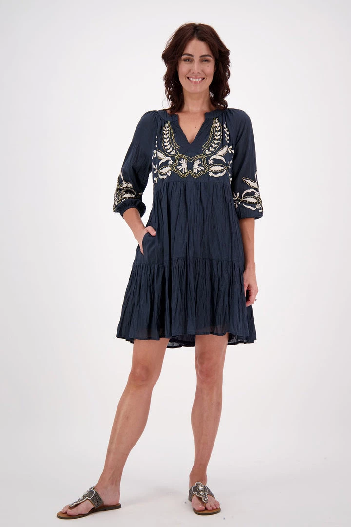 The Sami Dress is a Boho beauty , the dress for all occasions. From casual beach to picnics in the sunsets. Slips on over your head with a flatting V neck and 3/4 length sleeves. The yolk is embellished with a detail that will add a summer fun look.Â