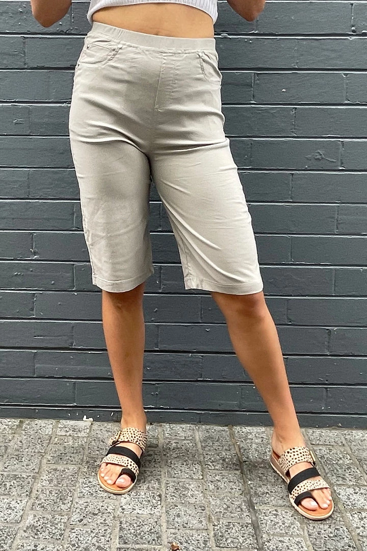 Cool and easy summer shorts, perfect for casual everyday wear. Pull on with an elastic waist. Front pockets with stud details. Back pockets. These long line shorts will sit below the knee. Pair with MAG9 embellished tees.Â