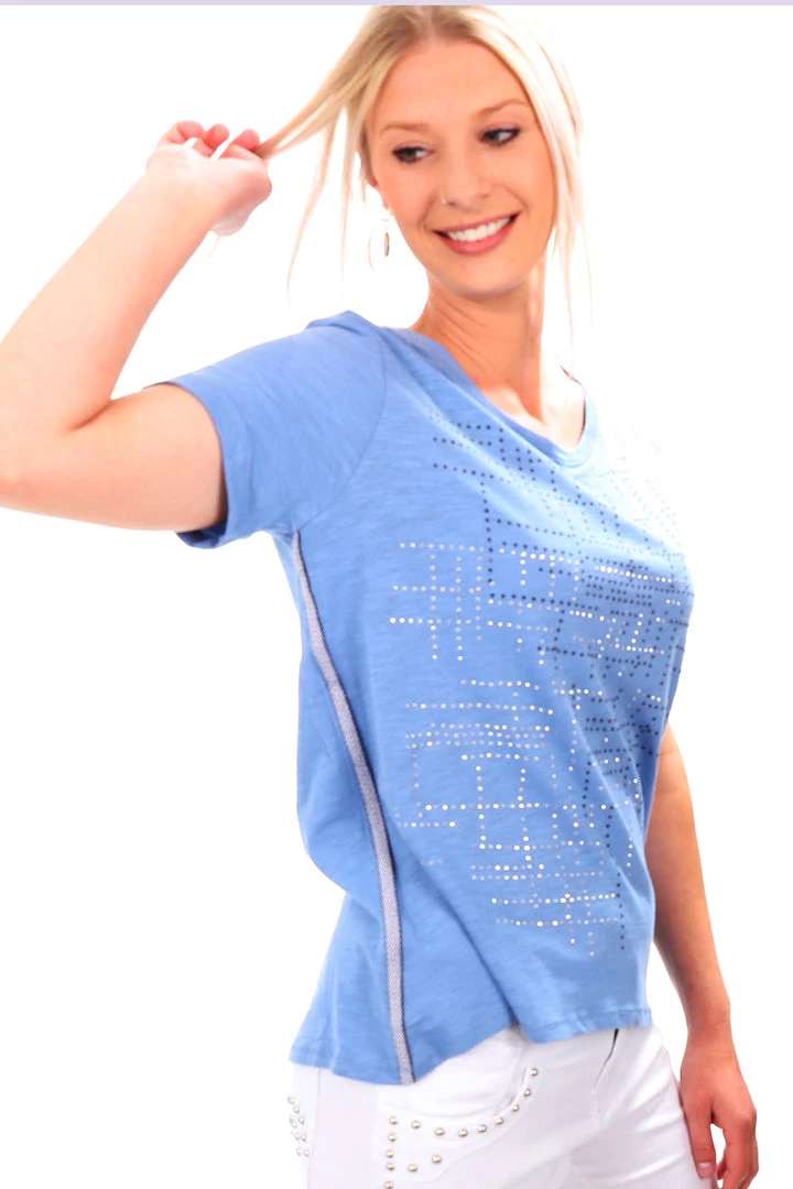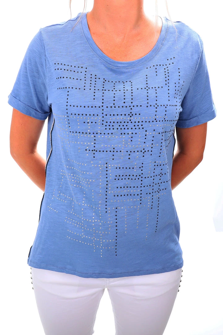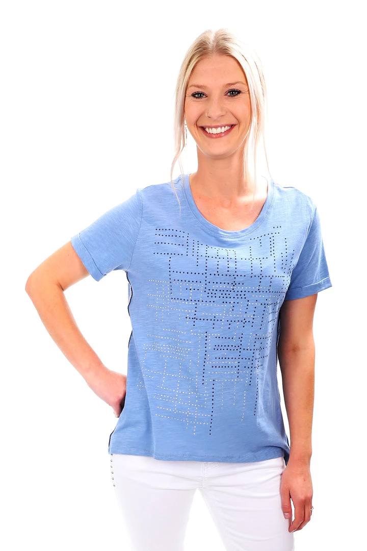 When you just need a smart tee, these 100% cotton tees from Maglia hit the spot. Basic round neck with a slight A line shape. Good sleeve with cuff. The sides have been finished with a contrasting tape. The front is embellished silver and black gems. The length from shoulder to hem is 64cm on a size 10. The back hem is lower than the front. To see all colours search MAG9