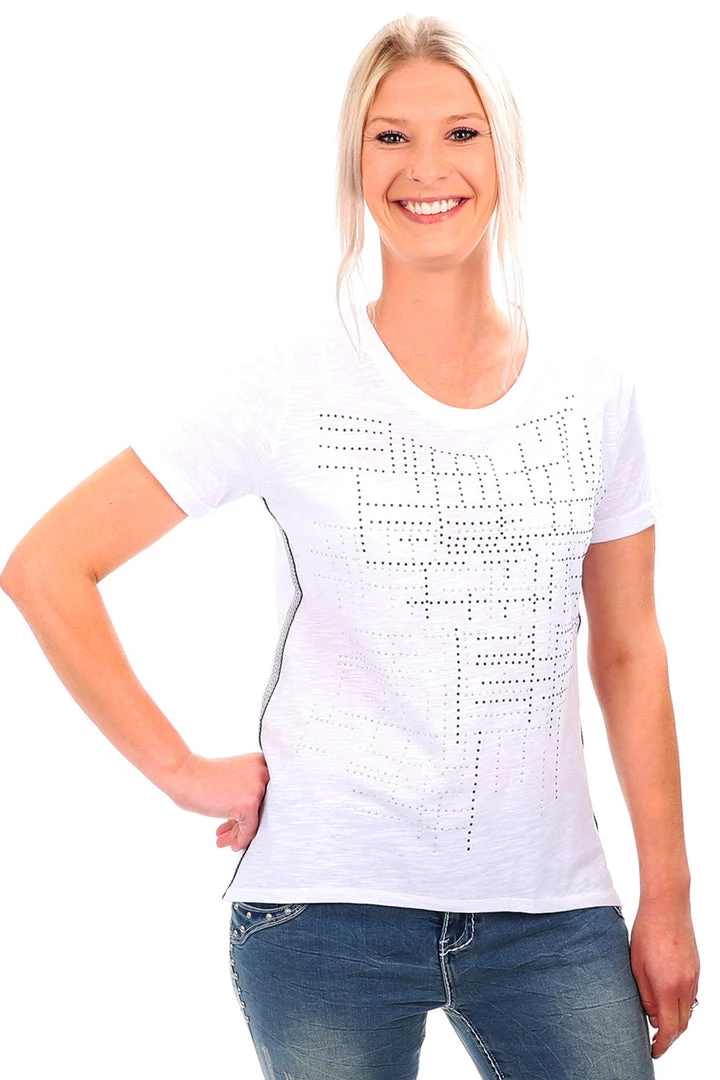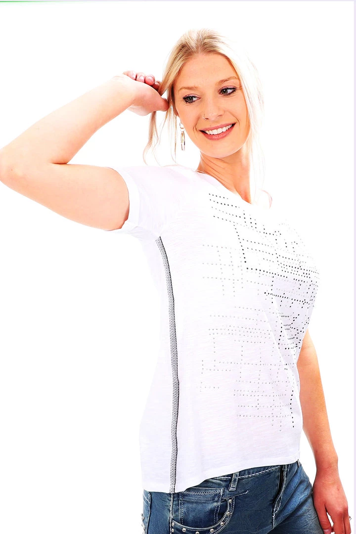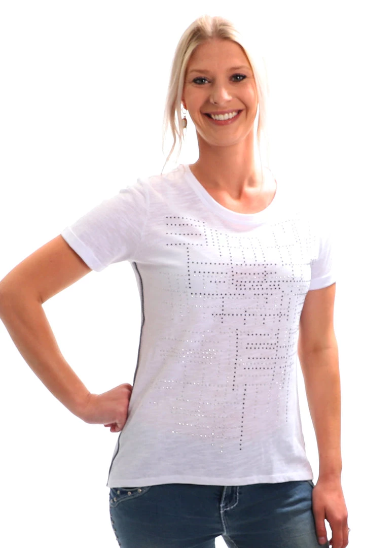 When you just need a smart tee, these 100% cotton tees from Maglia hit the spot. Basic round neck with a slight A line shape. Good sleeve with cuff. The sides have been finished with a contrasting tape. The front is embellished silver and black gems. The length from shoulder to hem is 64cm on a size 10. The back hem is lower than the front. To see all colours search MAG9