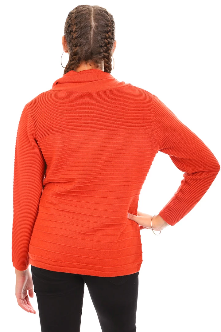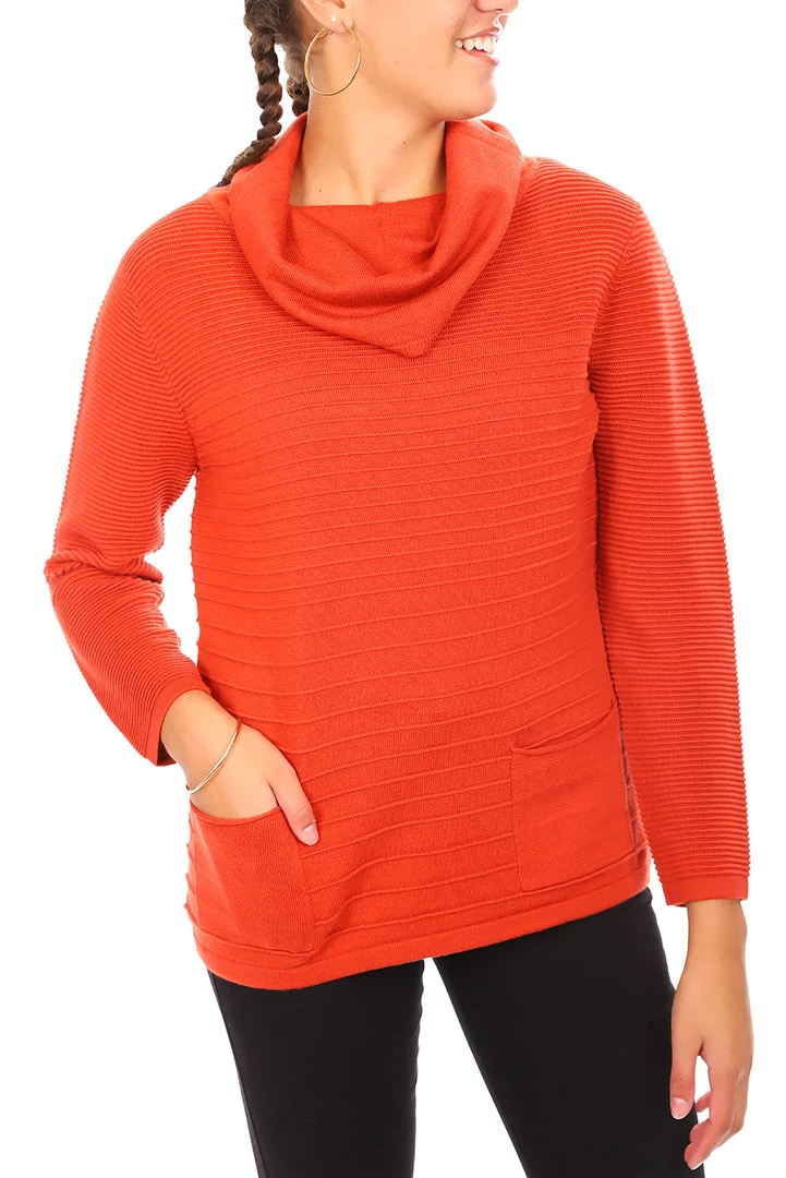 This rib trimmed knit by Maglia offers great style in a colour that pumps. The ginger tone of this knit with its cowl neckline gives a great fashion look. Team this knit with your favourite jeans and you will be warm, stylish and ready for action!
