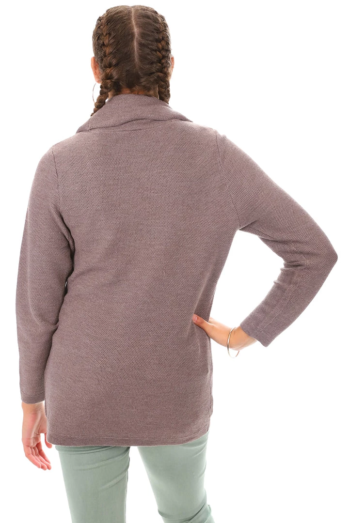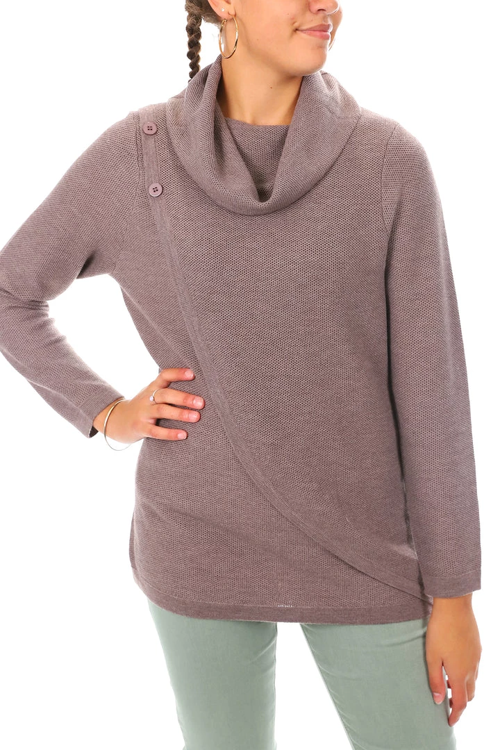 Natural tones are in and this oak is a great natural shade in a tunic style knit that is warm and comfortable. The cowl neck offers additional warmth. We love the long line look of this knit and it looks great over jogger pants or jeans with sneakers for casual days.