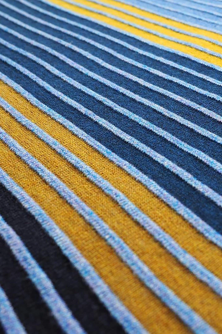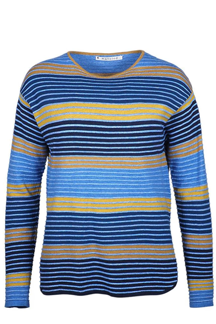 Soft marle blue and mustards are highlights on this contrast knit with a three dimensional texture. No need to work hard to accessories this jumper simply add your favourite jeans and a tan long boot and you have a great winter fashion look which is perfect for days in the country, lunches out or long walks.