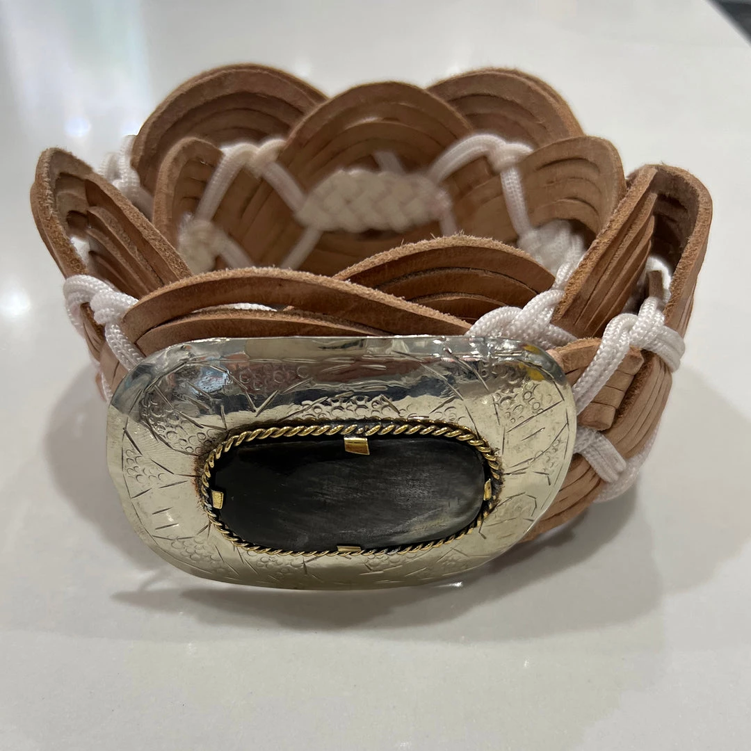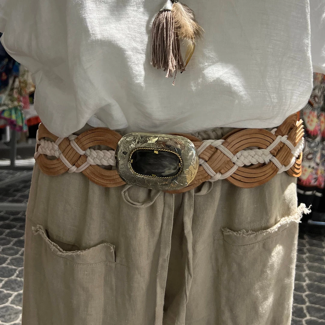 This belt is the one you dream of, Made in Morocco and styled by Miss June, Paris, this Bohemian styled Belt is met with matching quality Vintage silver buckle, Tan leather with feature cream weave its adjustable hook, allows you to have high or low on your hip. Â
