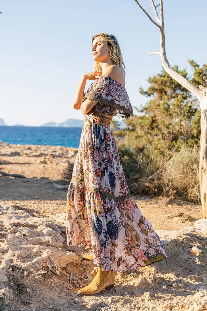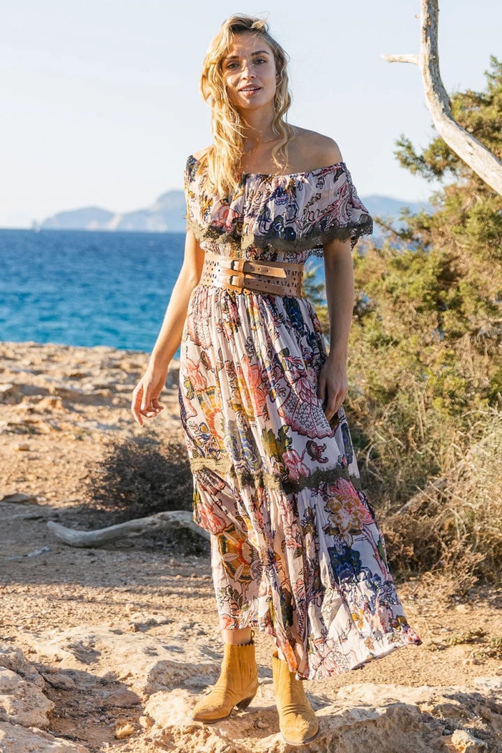 The Valencia Maxi Dress is an absolute fashion statement. You are sure to turn heads for all the right reasons when you wear this elegant and sophisticated maxi dress. The dress features a deep frilled neckline with sequin detailing and lace trim on the frill and a wide deep frilled skirt with more lace detailing. The shirred waist sits softly allowing the skirt to drape elegantly over the hips. This maxi dress is perfect for any event and can easily take you from a dinner out to being one of the best dressed guests at a stylish wedding.
