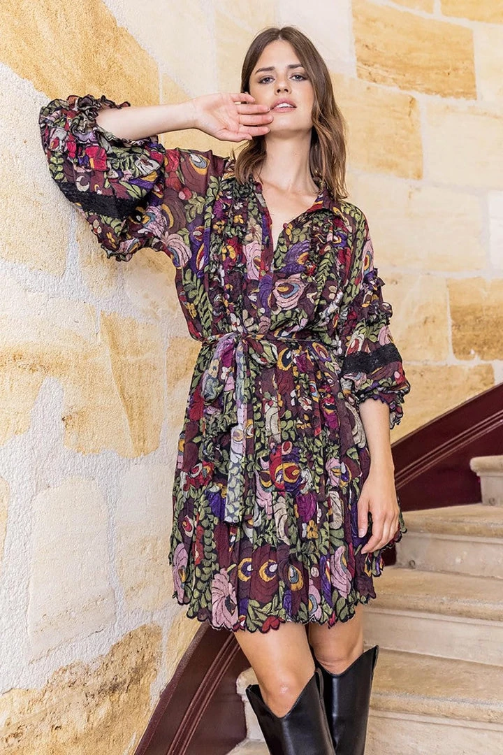 The Kira Dress is just stunning made from a crep rayon with lace & embroidery the kira dress is a must have dress with its exotic multi tones this dress comes with a slip. The Kira dress from Miss June has ballooned tiered sleeve & skirt that features stunning frilled layers with a wide cotton belt optional to wear.Â