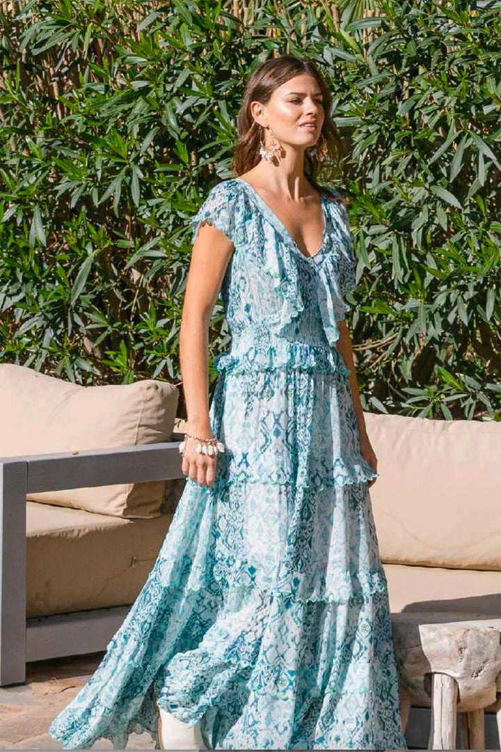 The Lilas Maxi Dress is an absolute fashion statement. You are sure to turn heads for all the right reasons when you wear this elegant and sophisticated maxi dress. The dress features a deep frilled neckline, tiered skirt . The shirred waist sits softly allowing the skirt to drape elegantly over the hips. This maxi dress is perfect for any event and can easily take you from a dinner out to being one of the best dressed guests at a stylish wedding.