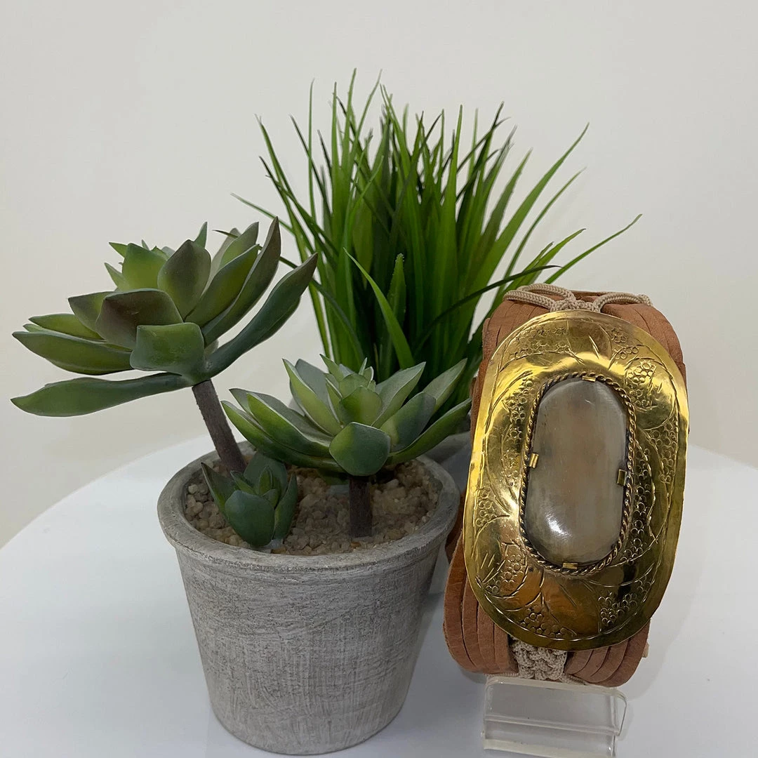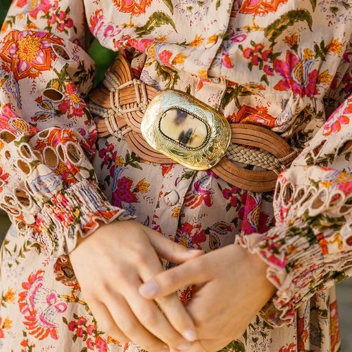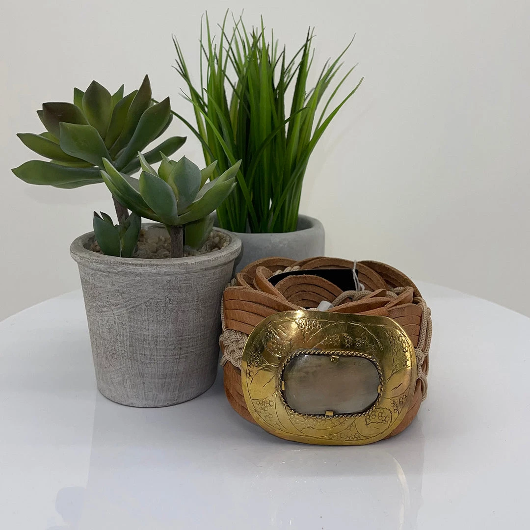 This belt is the one you dream of, Made in Morocco and styled by Miss June, Paris, this Bohemian styled Belt is met with matching quality Vintage Gold buckle, Tan leather with feature Taupe weave its adjustable hook, allows you to have high or low on your hip.