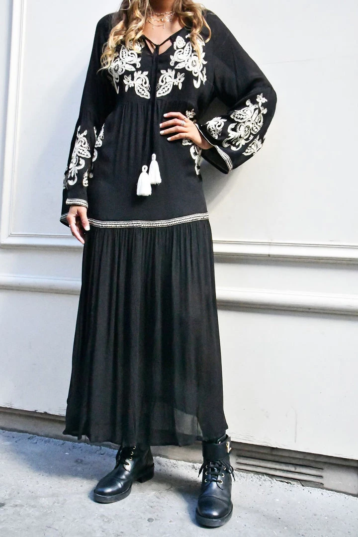 Miss June is designed in Paris and the Lucia Dress is lavish the stunning embroidered panels on the bodice and sleeves are highlighted in metallic thread. This dress has delightful bell sleeves and a tie tassel front. It looks perfect when teamed a pair of high heel long boots.