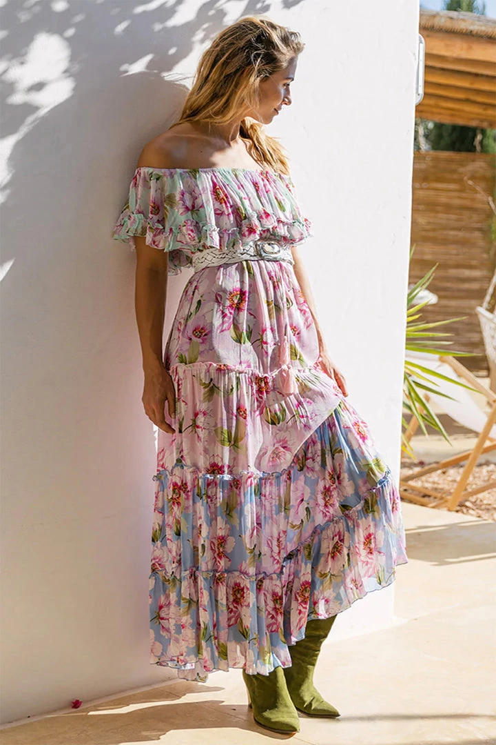 Looking for a dress to wear to special occasion this is your dress, The Roses Dress in green has an all over floral print, with an off shoulder style neckline a Sequence feather with in the frill bodice. This lined tiered frill maxi has a waist drawer string to shape your body.