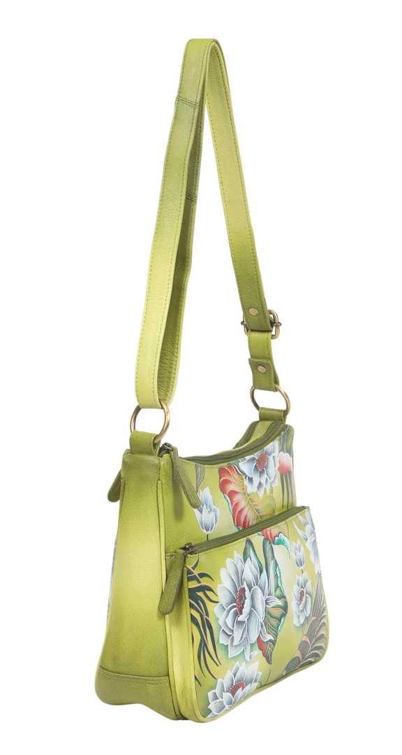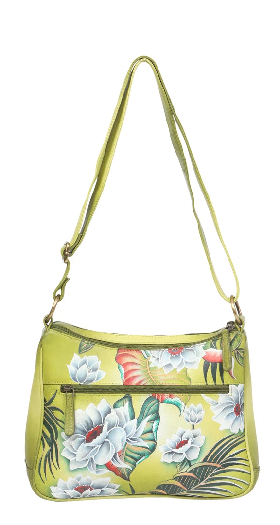 This Beautiful vibrant ladies cross the body handbag from Modapelle is hand painted. Features a top zipper closure with 2 main compartments , inner side zipper and phone pocket.