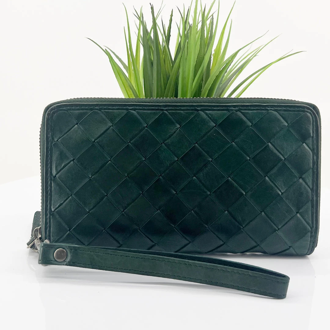 Large size ladies leather wallet with zip around too close. Boasts 16 card holder and zip coin pocket on the outside. Has large note slot and room for a phone. The wallet is RFID protected, so your cards are safe. Has wrist strap that can be attached. The front has a striking diamond weave. Â
