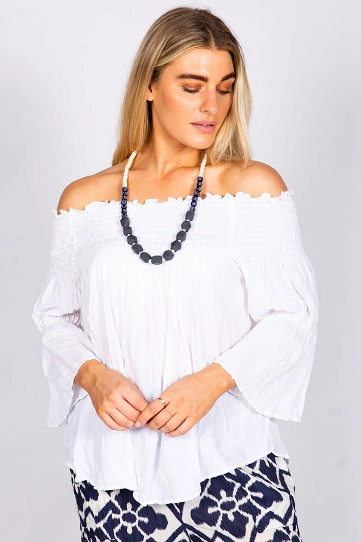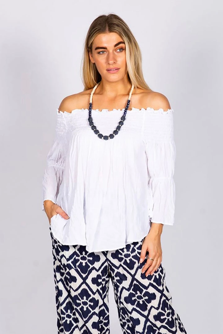 A statement off the shoulder top is what we all need this season. Feminine, light and all natural – the Cotton Off Shoulder Top in White is part of the Spice Up! collection and will change the way you wear natural fibres this season! Compliment your summer skin with this frill sleeve, off shoulder, crisp white cotton. The off shoulder neckline, relaxed silhouette and beautiful use of breathable fabric is sure to draw out the summer goddess within.