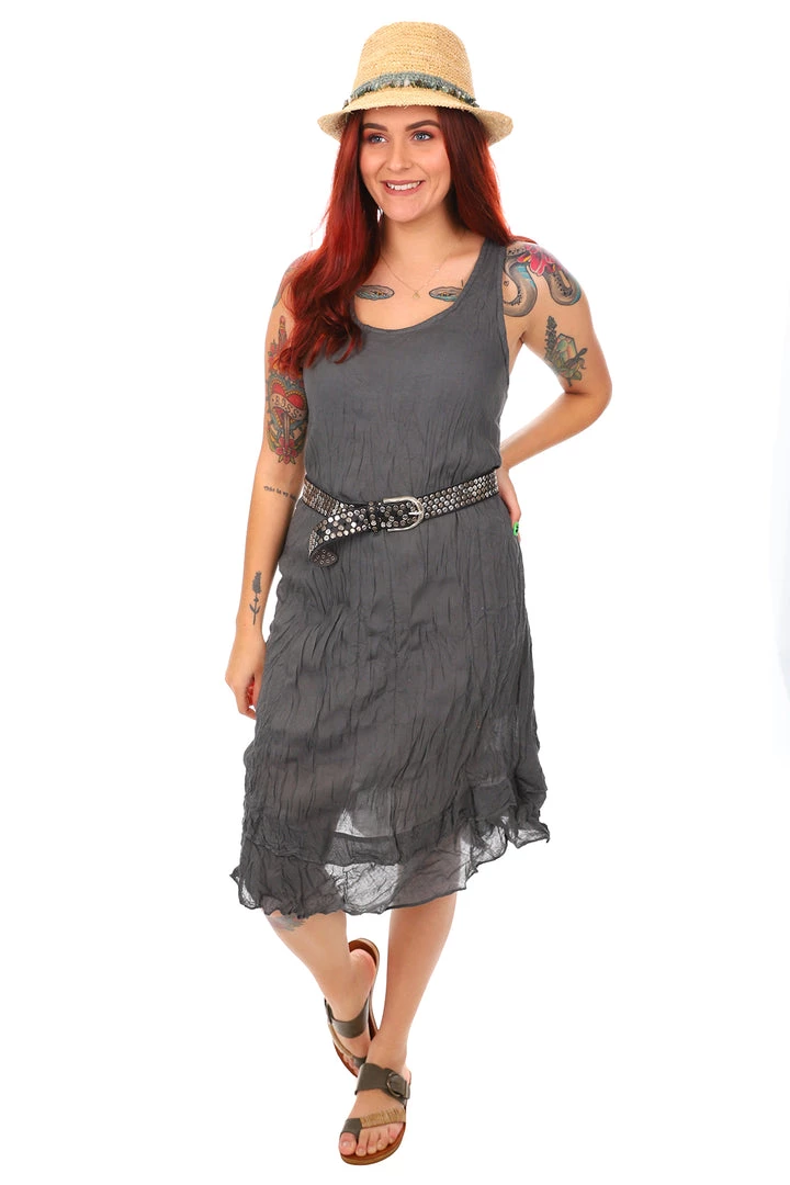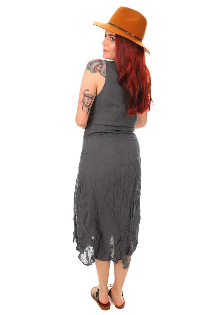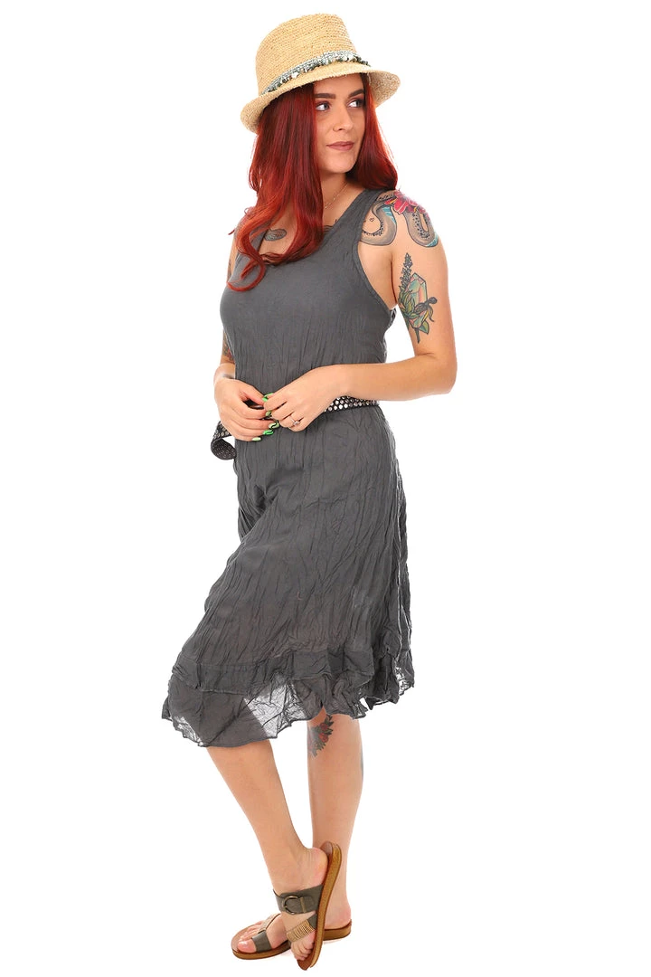 Fill your warmer days with natural, breathable fibres – the Sleeveless Cotton Dress in charcoal is a breathable, beautiful option that will bring life to your Summer wardrobe. This sleeveless cotton dress has an uncomplicated silhouette; a soft neckline and below the knee finish. The subtle frill on the hemline adds a touch of Pizazz, creating a flattering feature. With an easy going scrunch look and a soft A line glow, this grey cotton dress is divine.