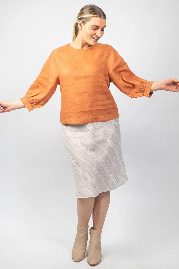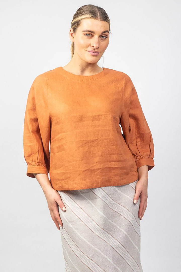 We love linen! Linen is cool and comfortable to wear yet stylish and elegant. This Linen top in the naturals Collection by Olive et Julie is perfect for every day. Wear it with a contrasting linen pant for an elegant casual look that is perfect for lunch out. Team it with a jean for a more casual look. The three quarter length sleeve is practical and generous. the top features a rear yoke with button closure.