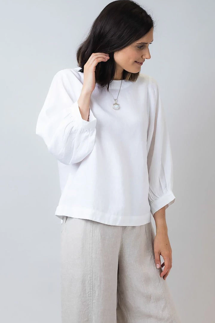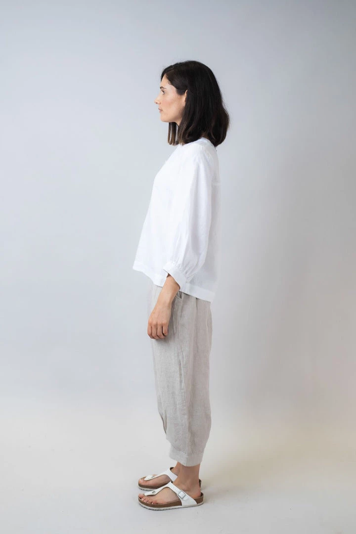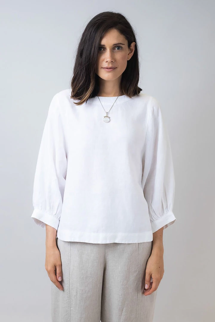 We love linen! Linen is cool and comfortable to wear yet stylish and elegant. This Linen top in the naturals Collection by Olive et Julie is perfect for every day. Wear it with a contrasting linen pant for an elegant casual look that is perfect for lunch out. Team it with a jean for a more casual look. The three quarter length sleeve is practical and generous. the top features a rear yoke with button closure.