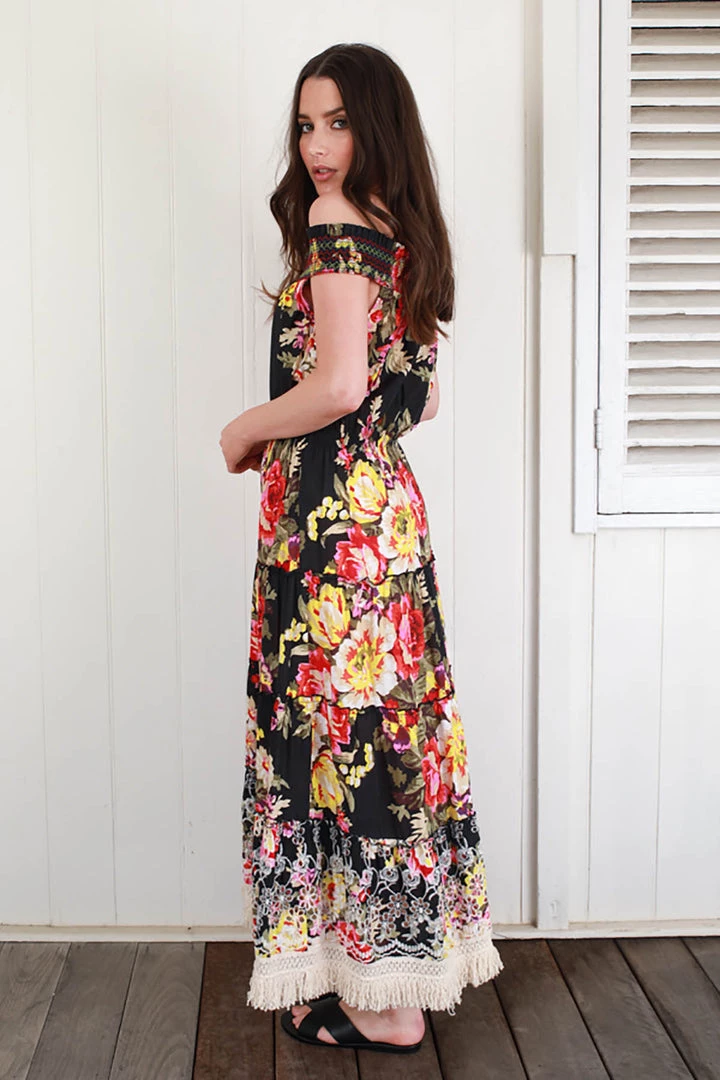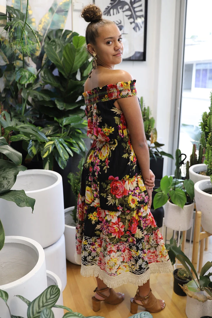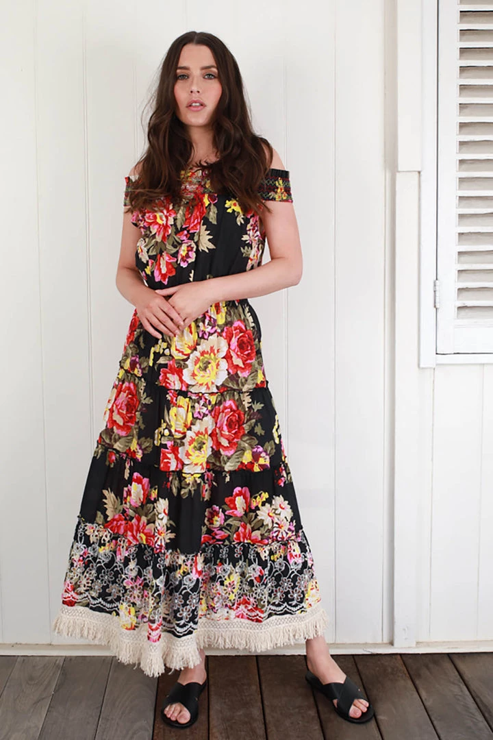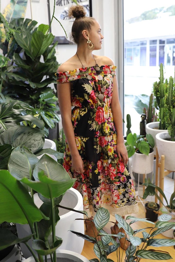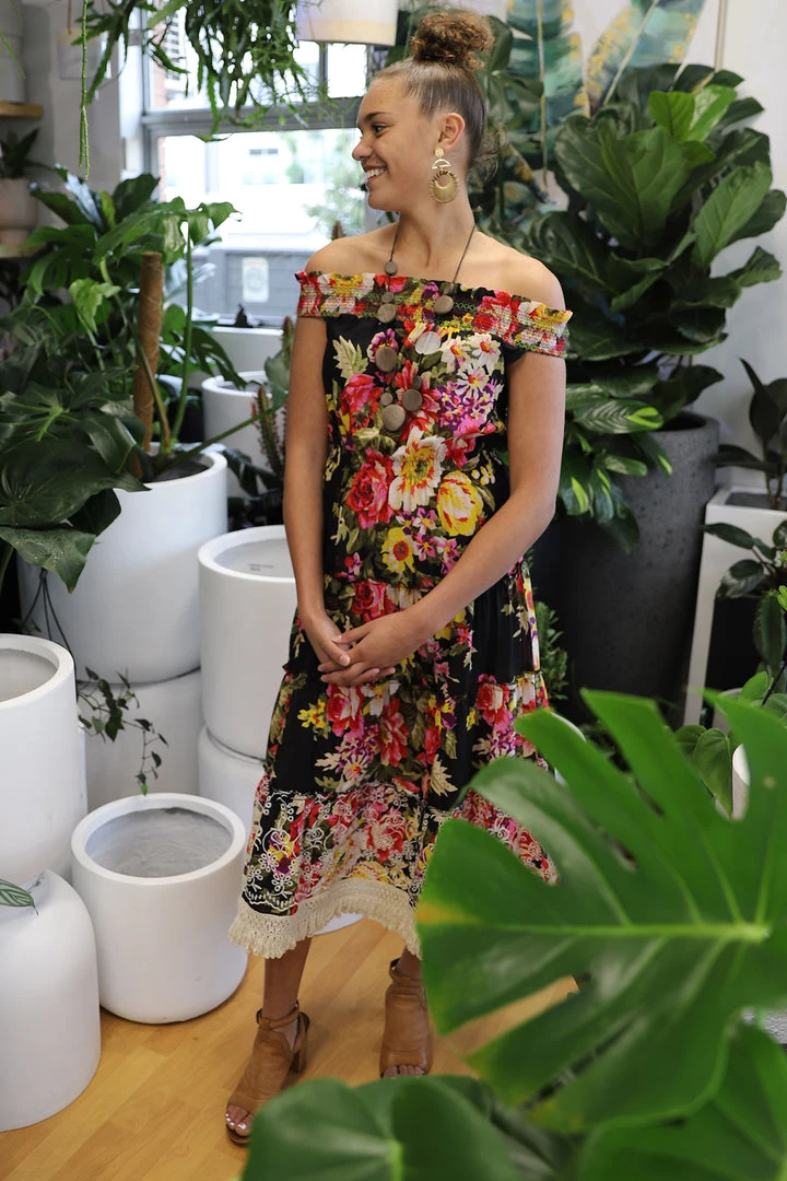 The Sorento Long Dress in Black Fiesta may be our favourite NAUDIC piece right now! The off the shoulder style and frayed detail hem creates the perfect spring dress. Floral is hot right now and we totally understand why when we have such beautiful pieces like this one. The maxi length is the perfect length and we couldn’t imagine this dress being any different.