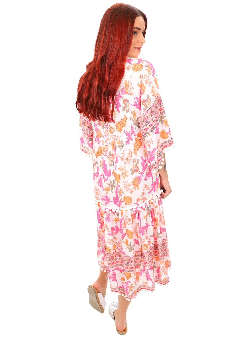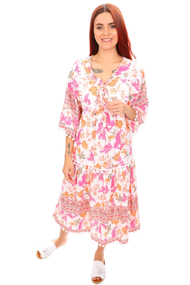 This fun easycare midi dress is great for long hot summer days. Trimmed with tiny pom poms and a delicate tie neck it is great for hot days and evenings. Midi dresses are perfect for petite ladies looking for some length.