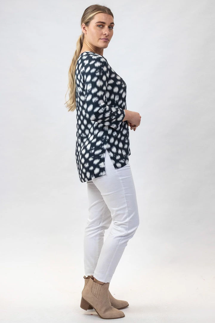 When you are looking for a top that offers style and comfort you simply can’t go past a classic tunic top. this beautiful tunic by Olive et Julie is classic and perfect for a day at work, however it is just as comfortable out to lunch. This tunic feature a flattering v neckline three quarter length sleeves and side splits with a slightly lower hem on the back. The elegant print is timeless. match this top with a black jean for a casual day out or go for a tailored pant and boots to create a corporate look that will have you sailing through your day in comfort.