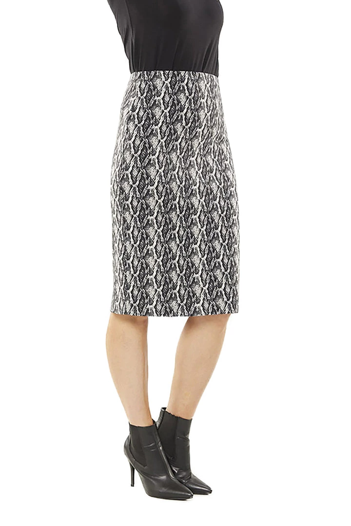 Pull-on pencil skirt in stretch fabric by Philosophy in Copperscale print, match with black ankle boots.