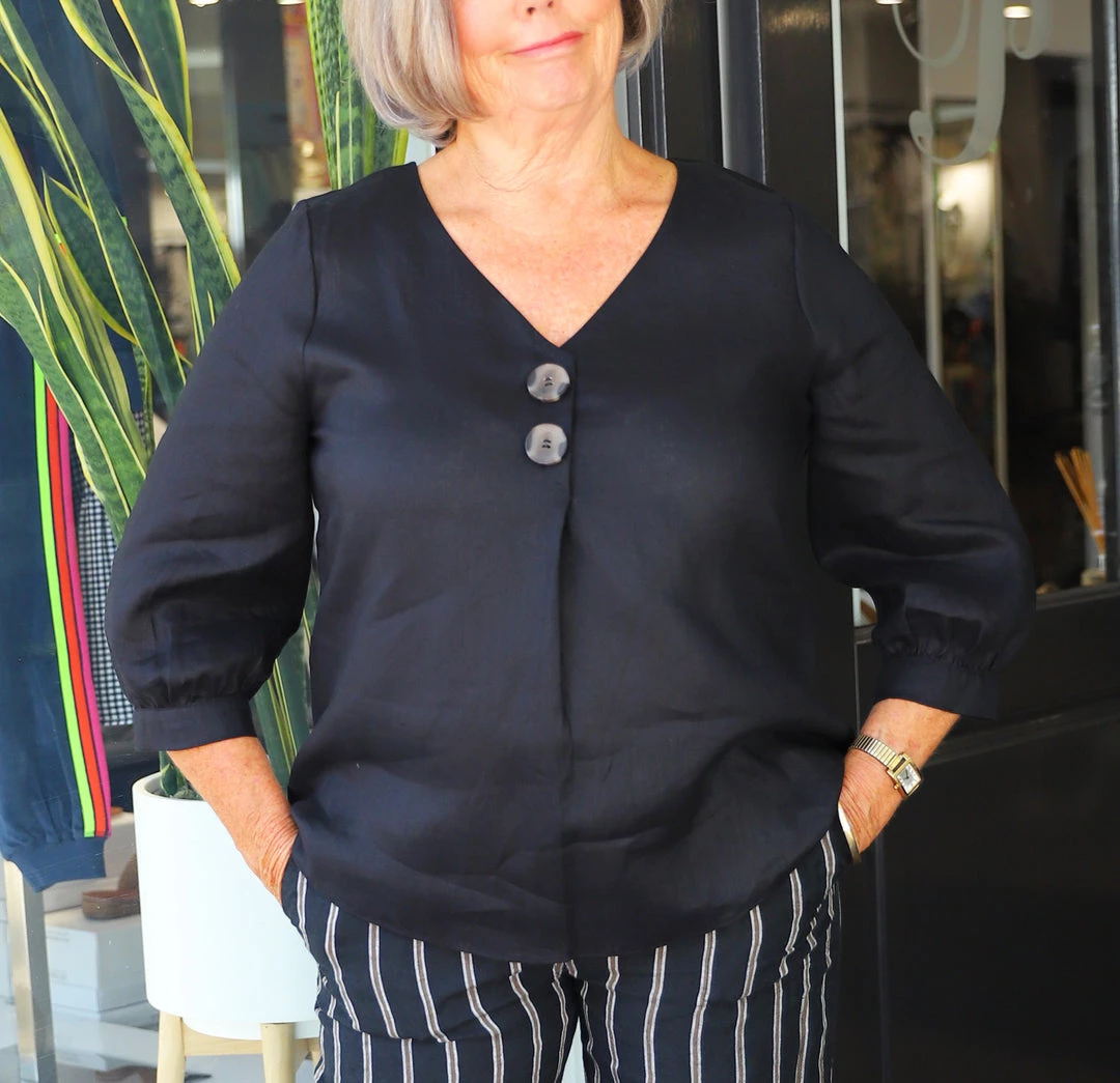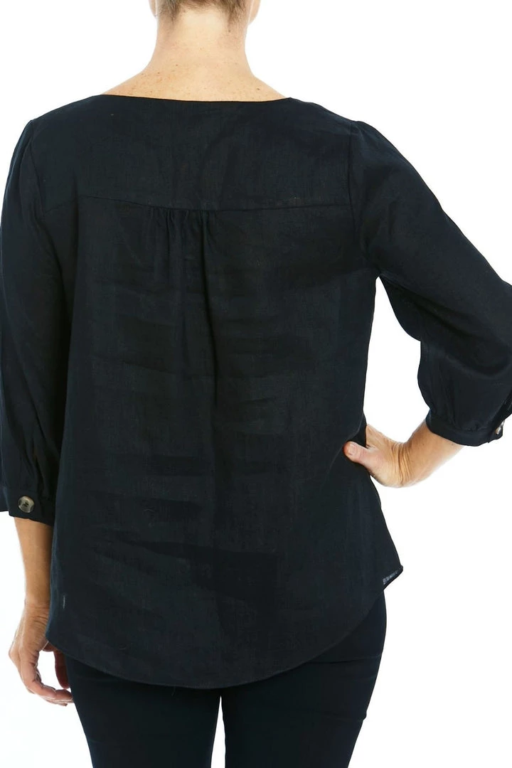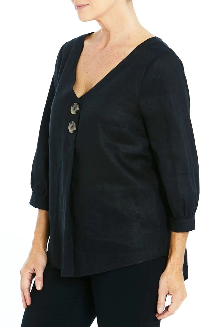Nothing like a little black top. This linen top from Ping Pong can be dressed up or dressed down. Slip on over your head with front button feature and pleat. 3/4 sleeve with matching button on cuff. Also available in White.Â