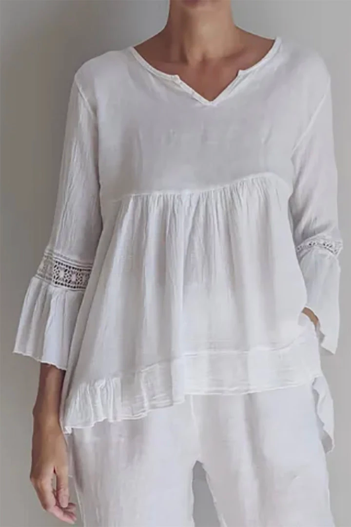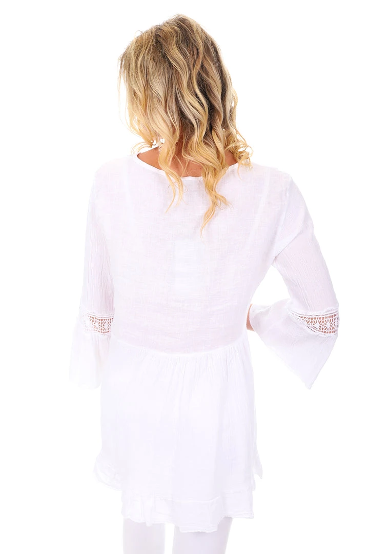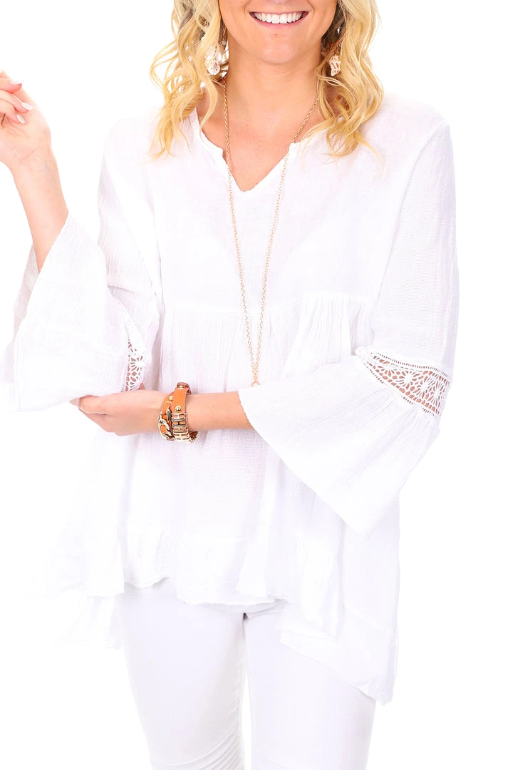 The Simona V Neck Linen Top in White is a simple statement that no one will forget! Made from a premium quality linen this V neck peasant inspired top has an olde worldly charm that radiates a thoroughly modern glow through the mesh detail!