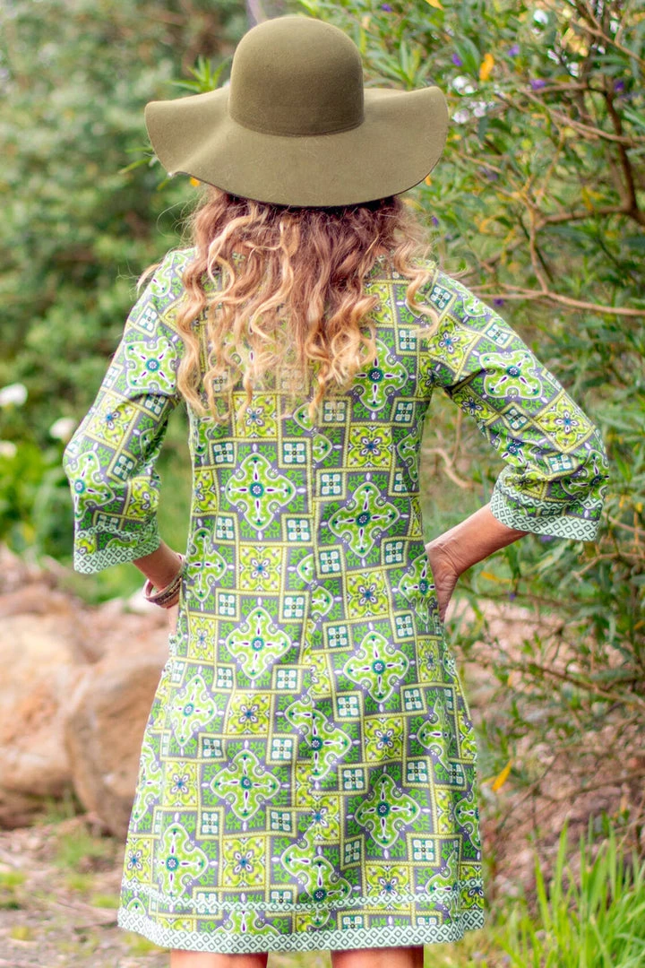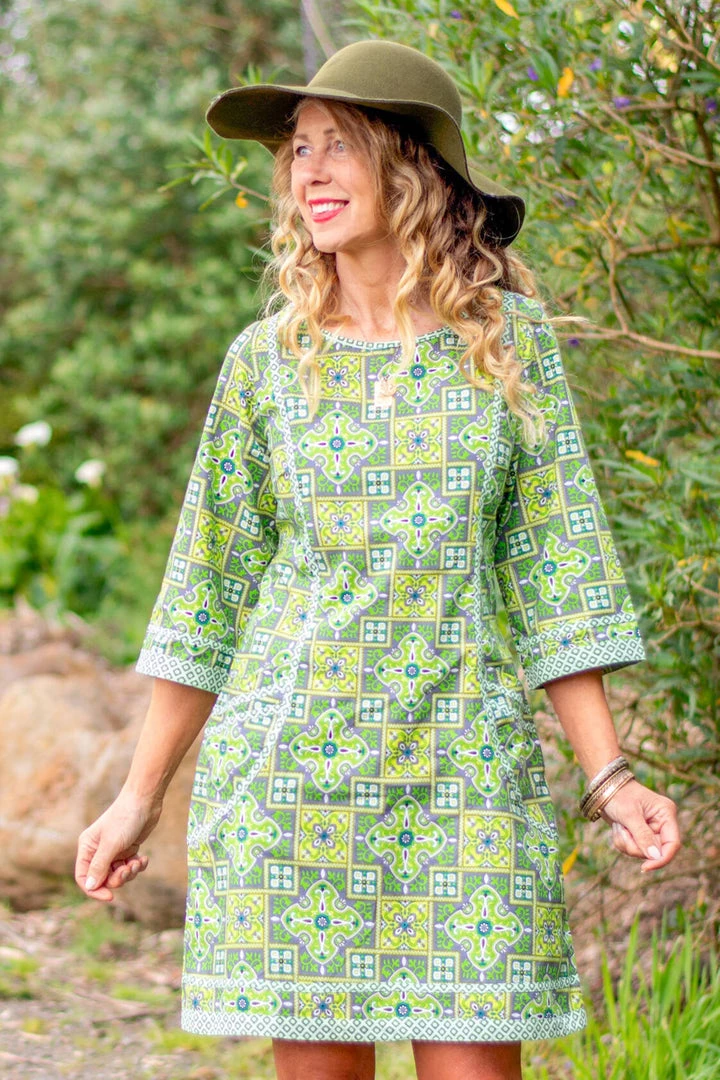 Meet Connie ! Our classic Cotton shift dress with plenty of trim detail, pockets and 3/4 sleeves. Connie is a beauty of a trans-seasonal piece, the  Connie dress is sure to get loads of wear in the coming seasons in our Stunning vintage Lime paisley print. She’s an above the knee length dress on most. Team the Connie with leggings, jeans, jeggings or as is. She’s good to go!