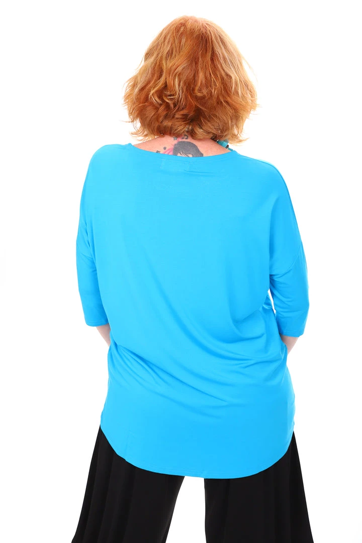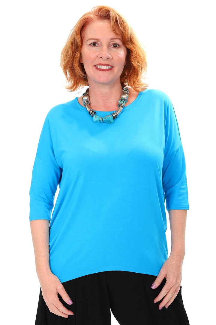 The Relaxed High Lowe Bamboo Top in Aqua by Whispers is a light weight, breathable basic to add to your every occasion wardrobe! With a 3/4 sleeve, straight cut, high low hemline and comfortable stretch this aqua bamboo top is a must have staple for all days!