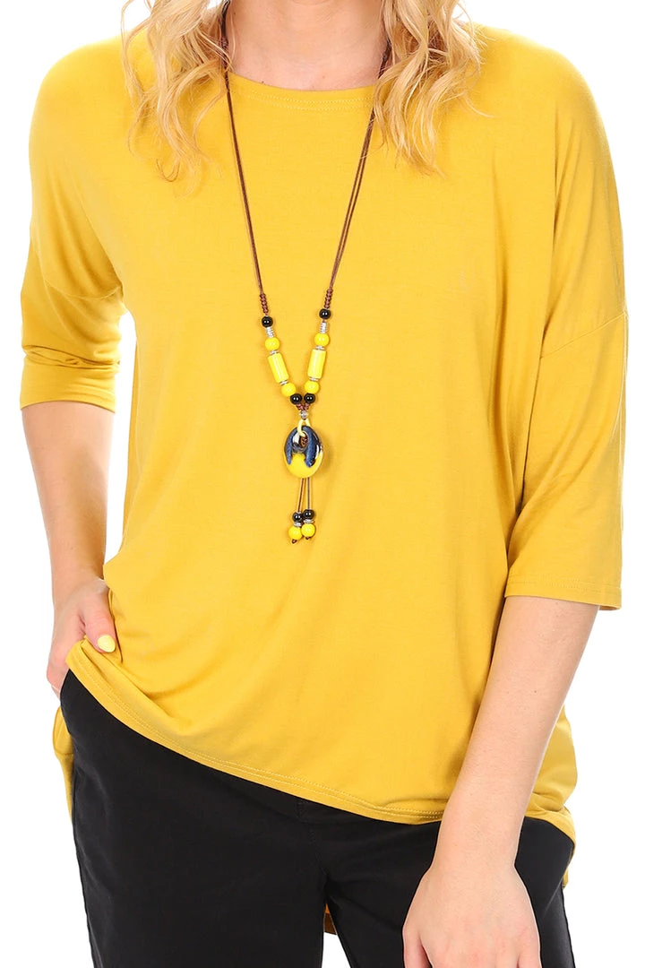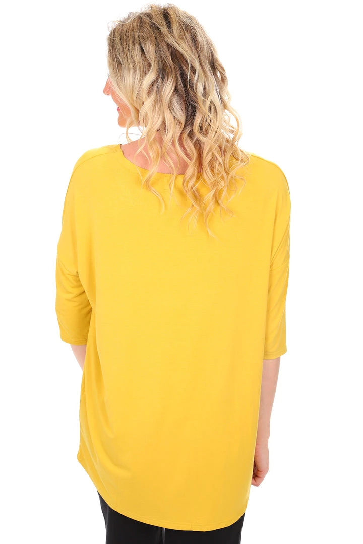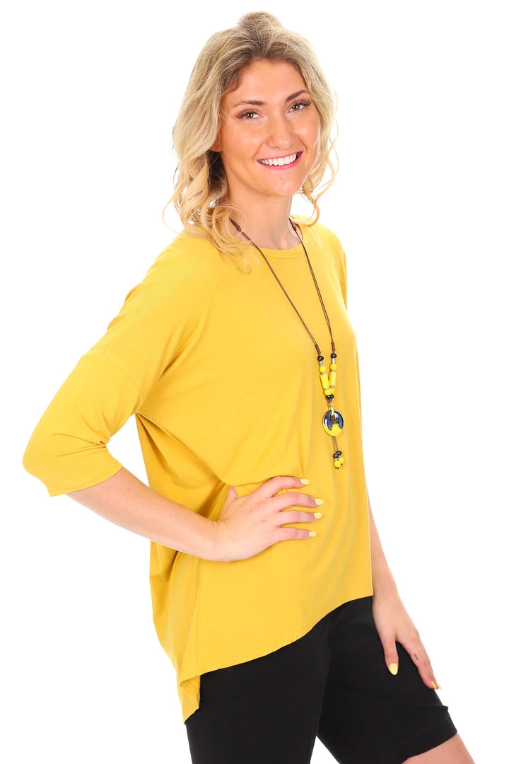 The Relaxed High Lowe Bamboo Top in Mustard by Whispers is a light weight, breathable basic to add to your every occasion wardrobe! With a 3/4 sleeve, straight cut, high low hemline and comfortable stretch this mustard bamboo top is a must have staple for all days!