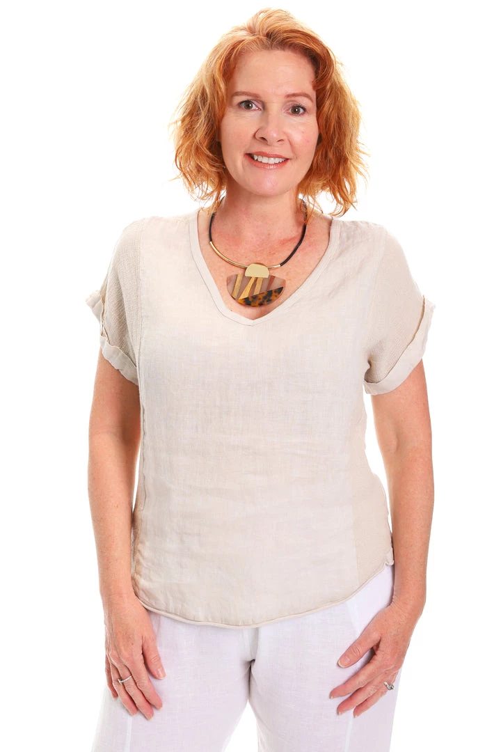 The soft beige Aria Tee in linen is here to make every outfit easy & low maintenance! With a soft V neckline and short cuffed sleeves this soft and breathable tee is perfect to throw on over linen pants or your denim skirt.