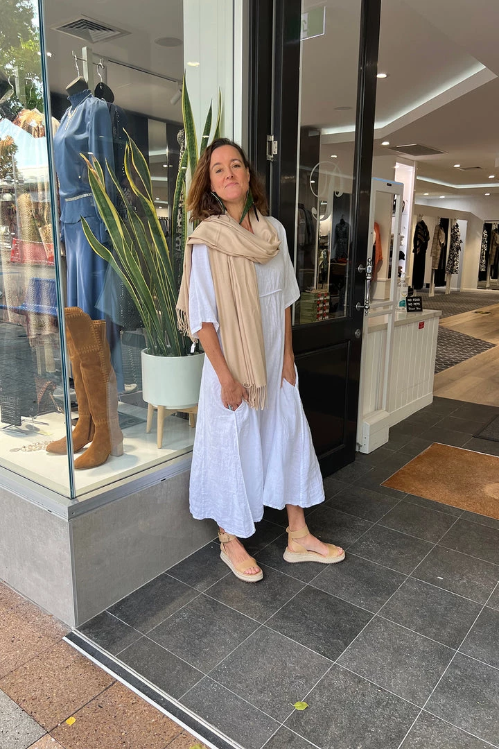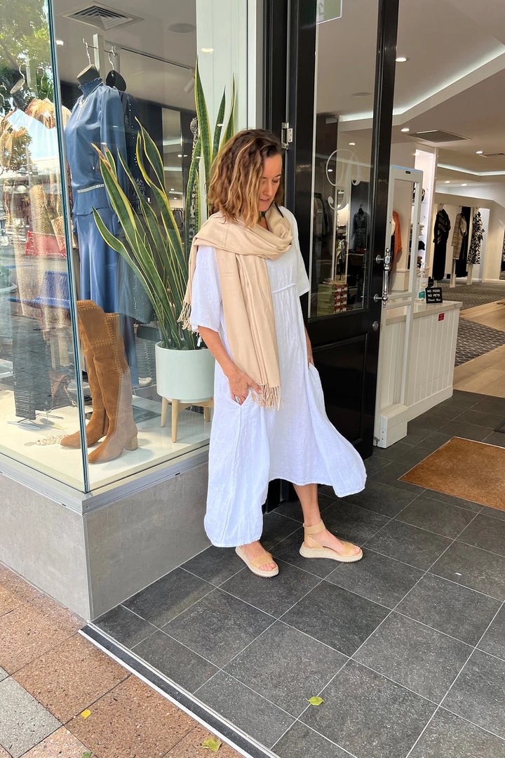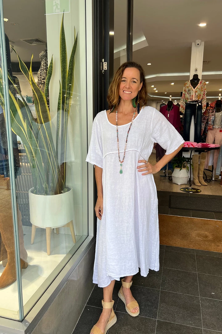 A linen dress is a must have for every wardrobe this season. The fabric is light and breathable., leaving you cool and comfortable all day long. The dress features a bust line piping with round neckline and great length sleeves for all seasons. Also available in Blush, Denim and Sliver