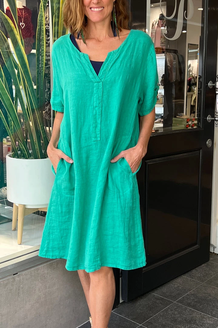 The beautiful Sadie dress in vibrant emerald colour, made from 100% quality linen the Sadie dress is just divine. Pair up the Sadie dress with a sandal, sneakers or pair of your favourite boots to complete your look.Â