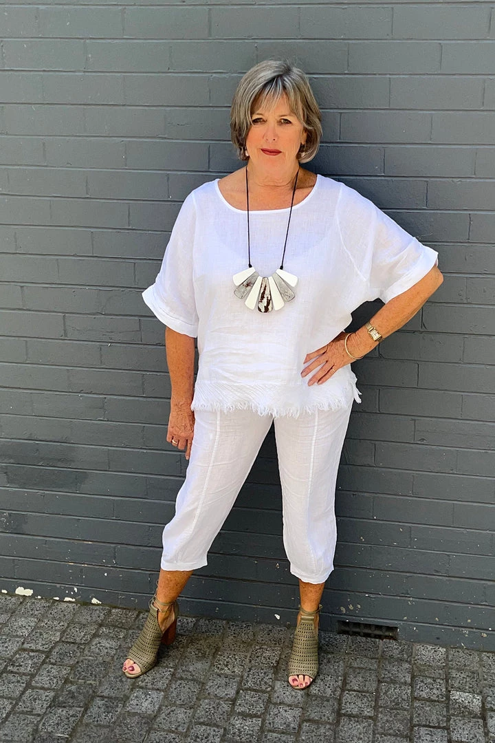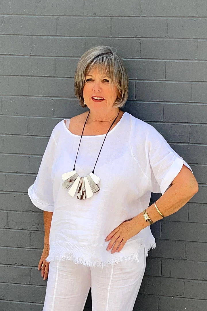 TheĀ luscious light weight topĀ in white is a beautiful addition to your multi-seasonal wardrobe, With anĀ understated glam look, this linen shirt has a thread hemlineĀ feature. Thanks to the simplistic beauty of thisĀ linen top it is great for wearing over linen pants, Perfect for coffee dates, cruising and relaxing in!