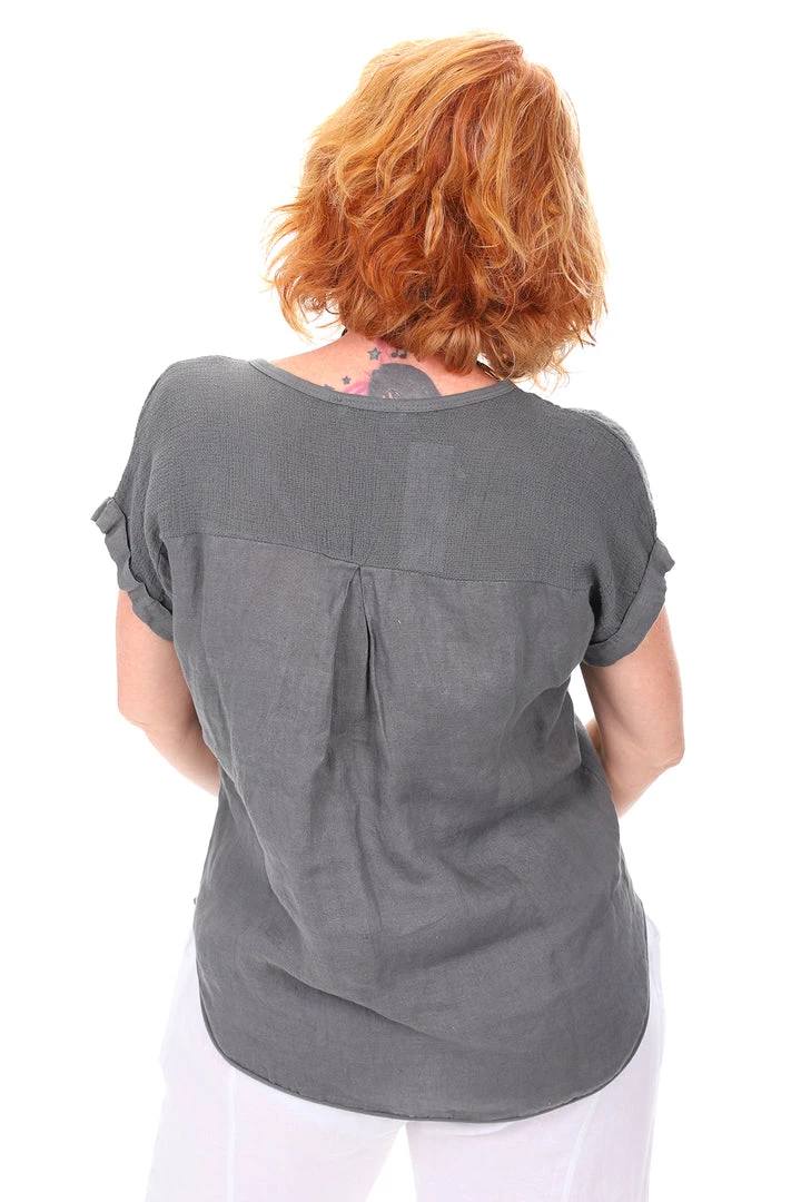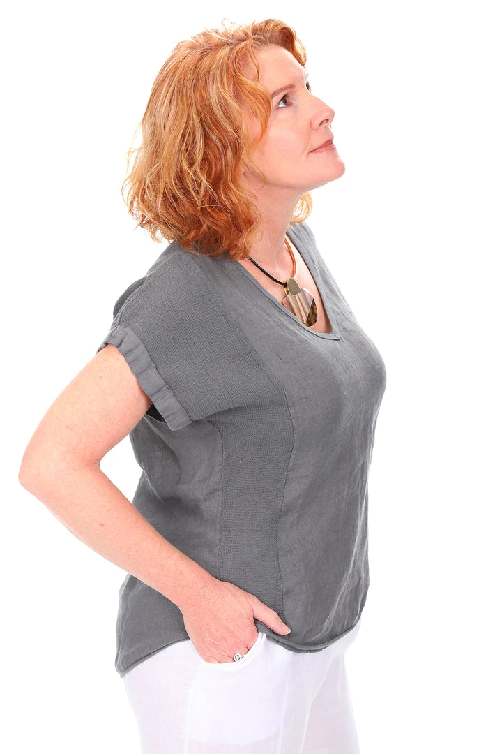 The soft charcoal Aria Tee in linen is here to make every outfit easy & low maintenance! With a soft V neckline and short cuffed sleeves this soft and breathable tee is perfect to throw on over linen pants or your denim skirt.