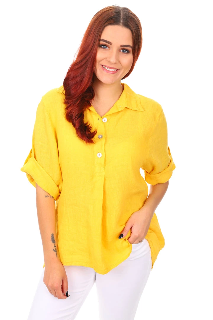 The button up Edie Top in Mango is a beautiful addition to your multi-seasonal wardrobe. With an oversized shirt look, this linen t-shirt buttons up at the front and the back and finishes with a collared neckline. With a high low hemline this linen top is great for wearing over linen pants. Perfect for coffee dates, cruising and relaxing in!