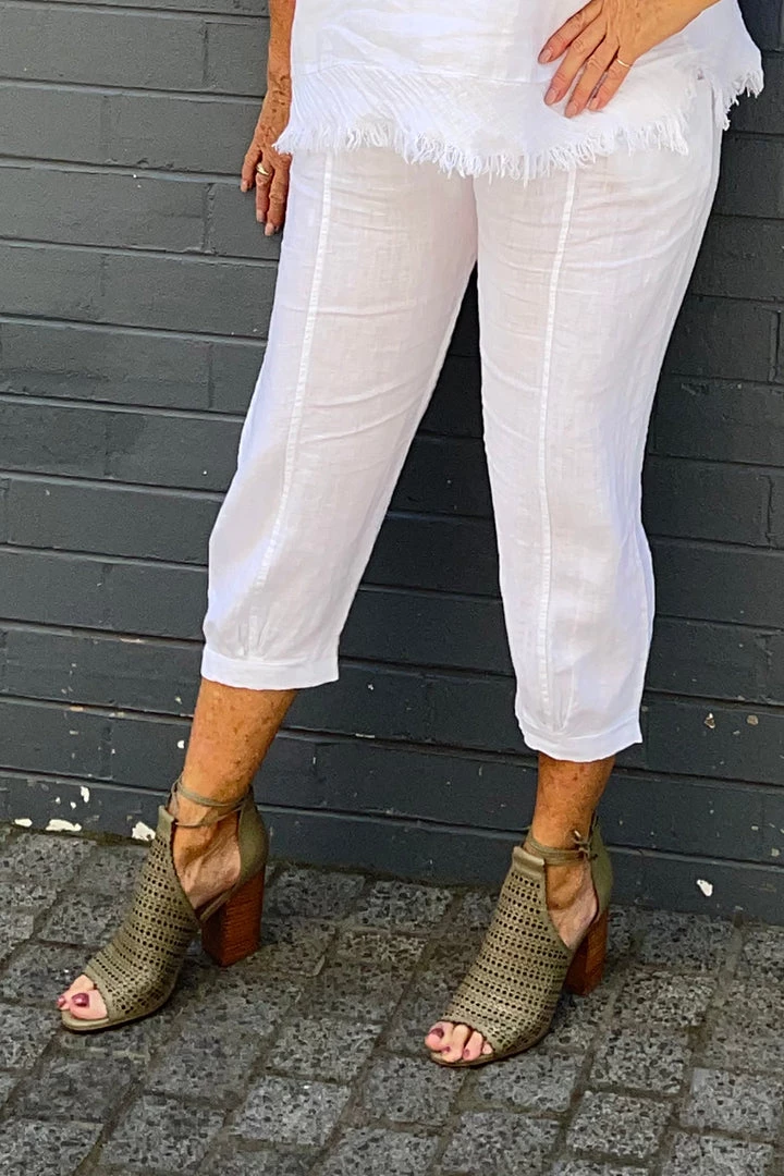 Linen is the must have in Soft Sofie Linen Pant this season. The fabric is light and breathable. Leaving you cool and comfortable all day long. The Pant features side pockets, a band on bottom hem these pants will sit just below your knee with comfortable elastic waist band.