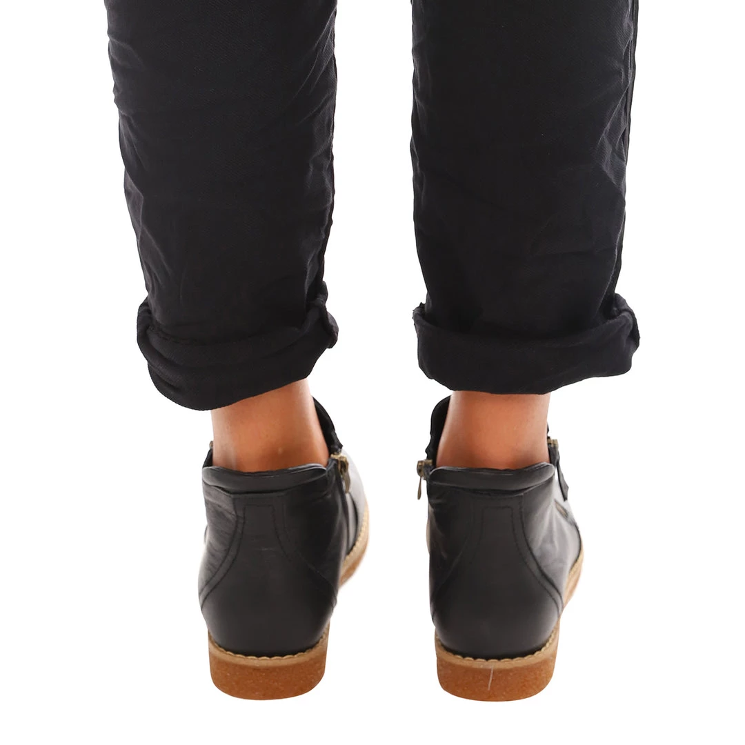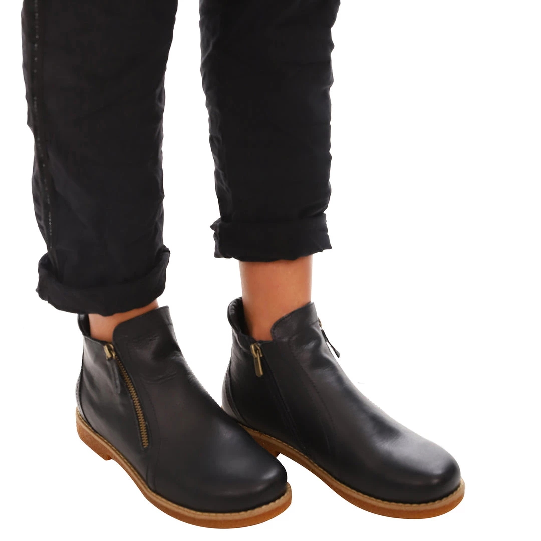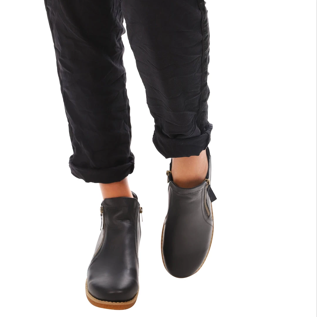 Rilassare offers superb comfort and style. These short boots are designed and made in Europe from quality leather. The Tallow short boot is perfect for with jeans and pants. They offer an easy fit with a zip closure and a semi industrial feel with the sole stitched and textured sole. Team these with a black denim jean and a comfort knit.Â