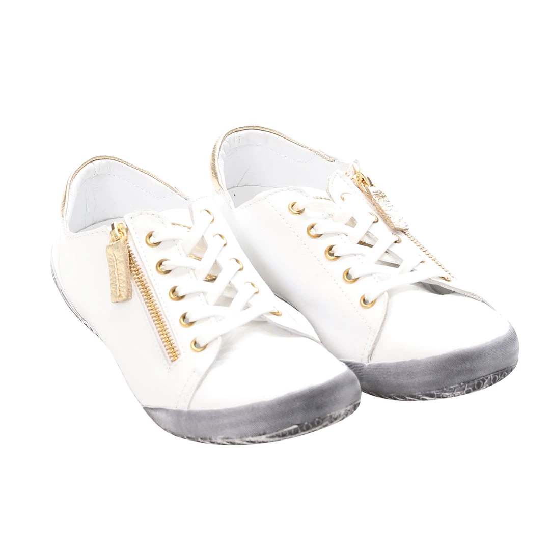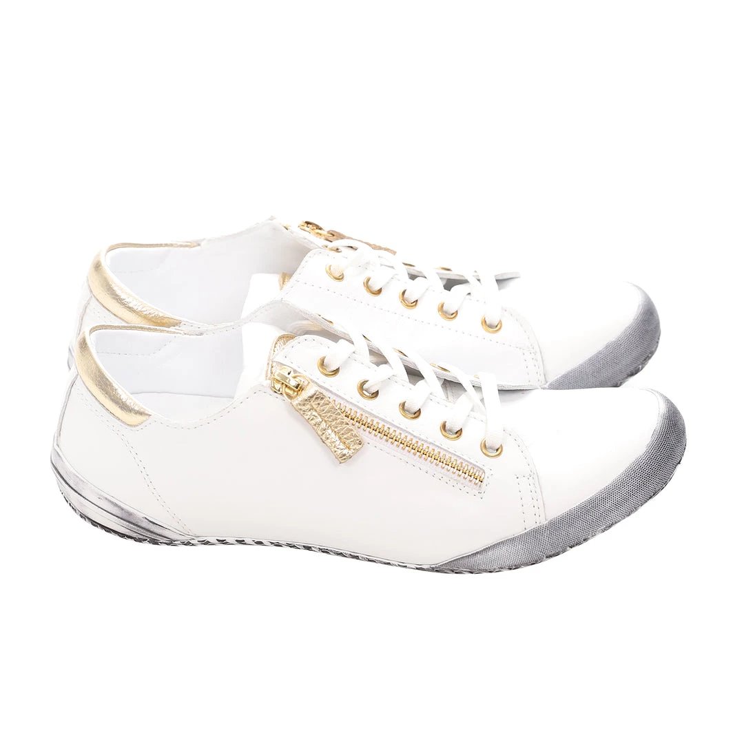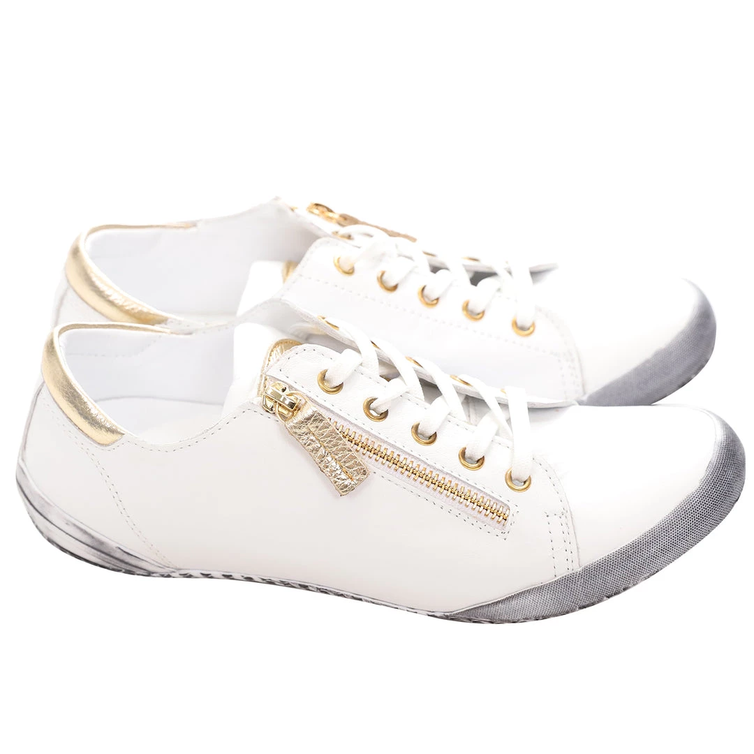Rilassare offers superb comfort and style. These delightful sneakers are designed and made in Europe from quality leather. The Tess Flat Sneaker is a fun option for everyday wear. They are perfect for wearing with with jeans and pants. They offer an easy fit contrast gold trim, with a zip closure and a toe kick and textured sole. Team these with a black denim jean and a comfort knit – complete the Pizazz look with a star print or textured top!