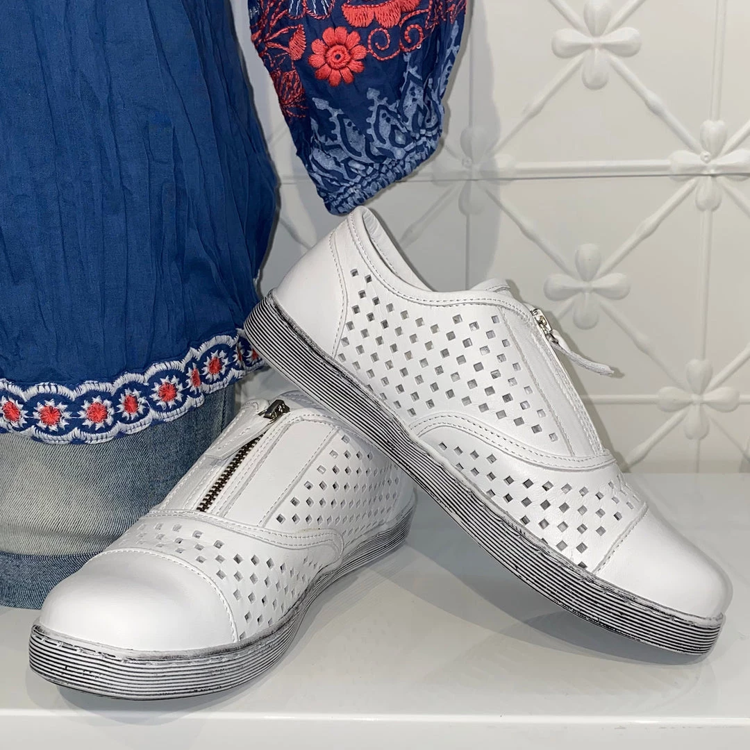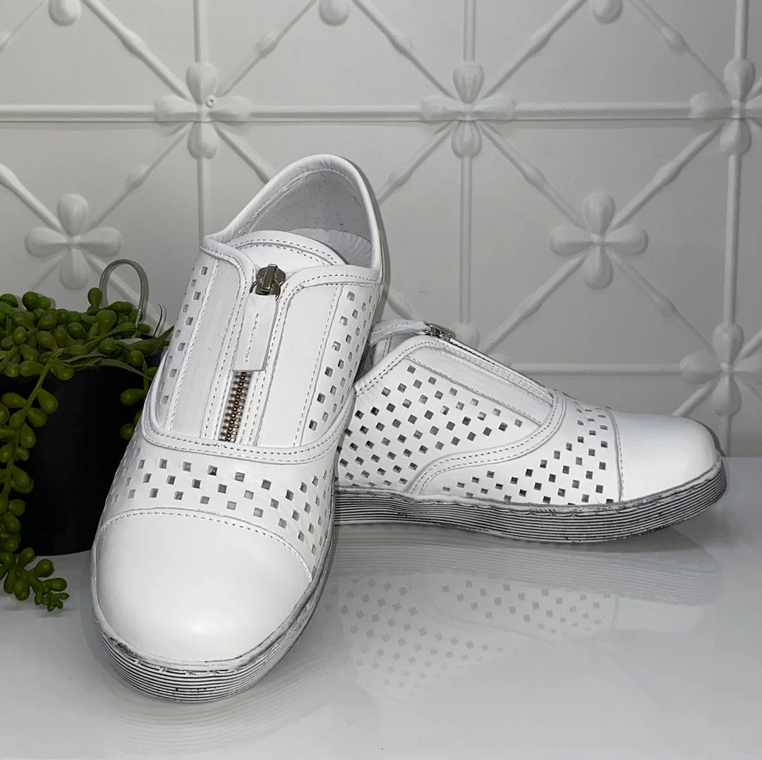 Light and featured laser cut leather, looks great with all your summer and seasonal pieces, great to through and in the bag and now you can walk for hours and still look good at the Country Club for lunch.
