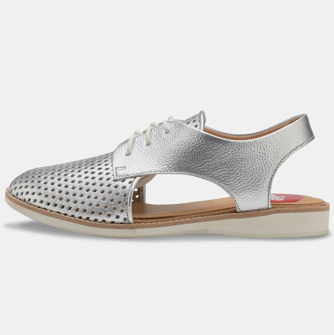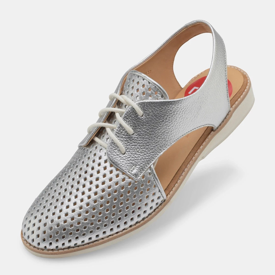 Made with soft silver leather with punch hole detailing and sidecuts, this take on a classic will keep your feet feeling cool in summer. Like all Rollie shoes, the Slingback Punch is comfy and light, the perfect shoe for all day wear.
