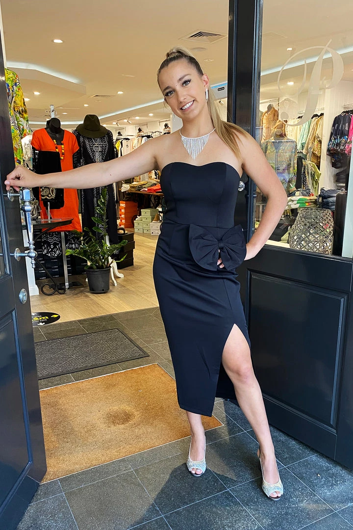 This Little Black Dress is just devine, for occasions when you need to make an impression. Strapless with a sweet heart neckline. The oversized bow on the waist and thigh split to hem is timeless glamour. Pair with stilettos and a statement clutch. Also available in Powder Blue.Â