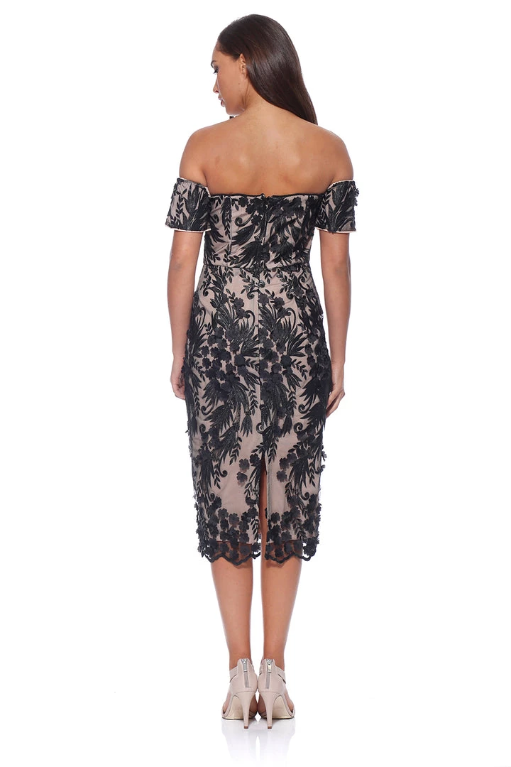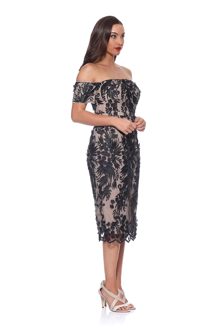 The Violet sleeve dress features exquisite black shimmering lace & flower appliqué, with nude lining. Can be worn with or without the thin adjustable shoulder straps. Perfect for Weddings, Bridesmaids, Races etc.