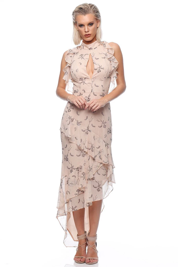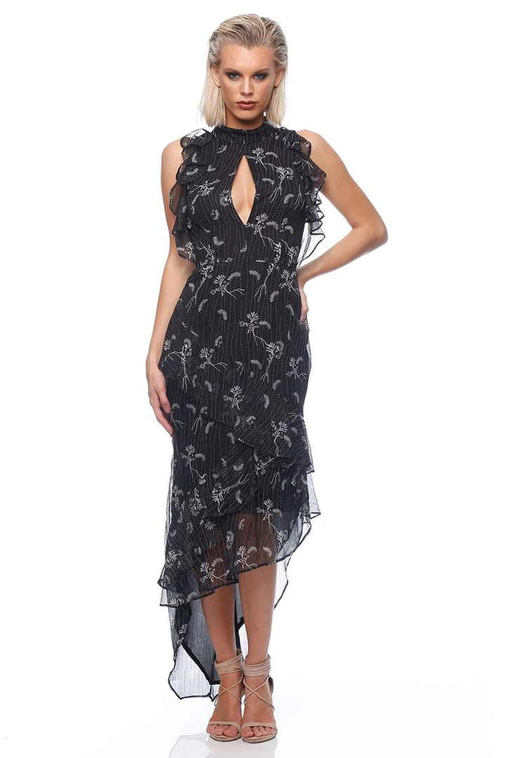 A Romeo and Juliette type romance infused into the most spectacular halter neck formal dress you’ve ever dreamed of wearing! Her fit and flare silhouette wraps your body in soft, frilly love while her keyhole detail on the front takes the heaviness away from around your face. The delicate and feminine print works with the breathtaking shine of the silver detail to transform you into a goddess! Oh, and did we mention she comes in black too?!