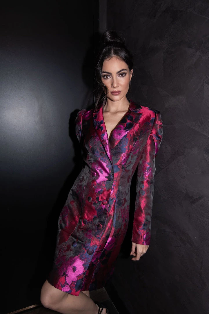 You will be set to celebrate any occasion when you wear this elegant evening jacket Romance. This jackets floral print with highlights of navy, burgundy, magenta and purple is simply beautiful. Wear it with a pair of elegant black evening pants for a statement look with black heels or go all out and highlight the outfit with a bold statement pair of shoes in Magenta or purple. There is also a matching off the shoulder dress available.
