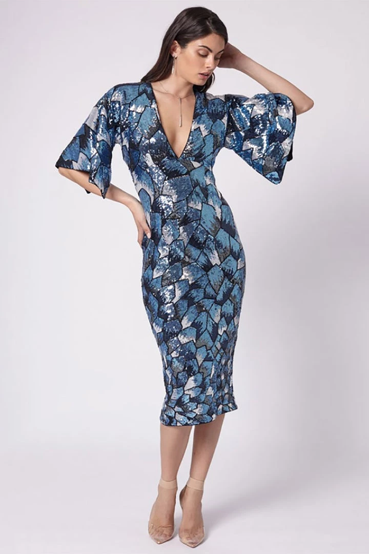There is nothing more powerful than a well dresses woman! The Notre Dame Dress in Navy Blue by Romance the Label is a sensational statement dress dripping with sequins and glamour! The plunging V neck and split frill sleeves give you a sense of unstoppable confidence!! The midi length and split back add class to this completely beaded blue and silver cocktail dress!