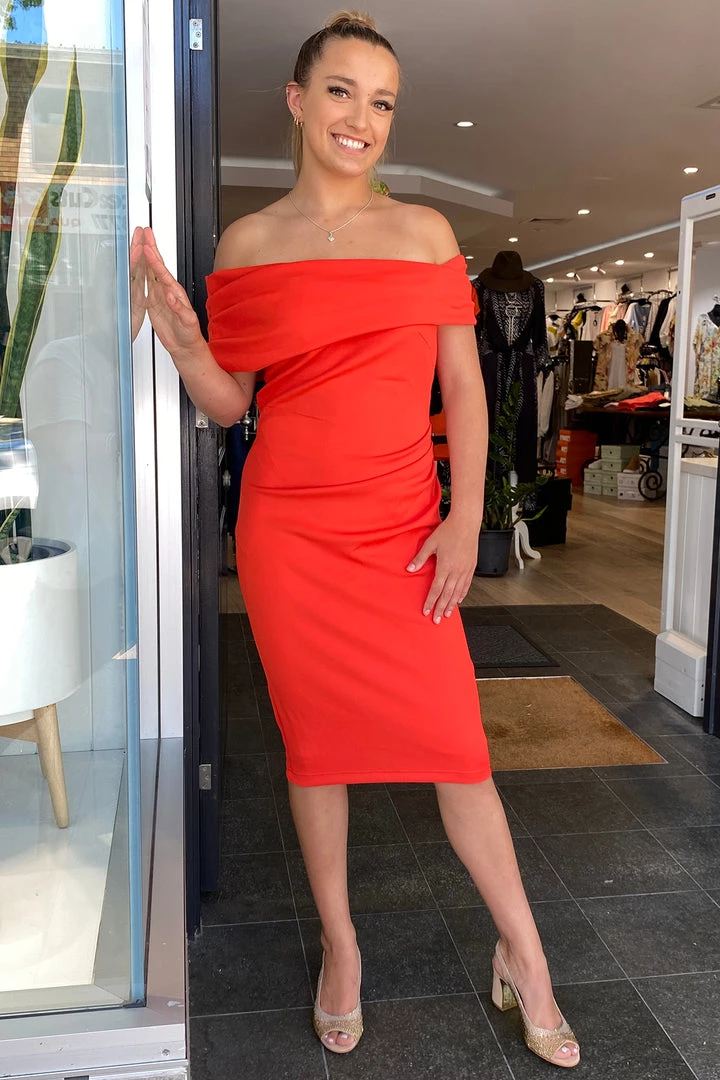 Formals, weddings or race day. This off the shoulder dress is set to impress. The off shoulder wraps around the top of the dress and has a pleat detail. The left side is smaller than the right in width. There is figure flattering pleats on the left side at the waist. There is a zip under the left arm. The soft fabric will give you all day comfort.Â